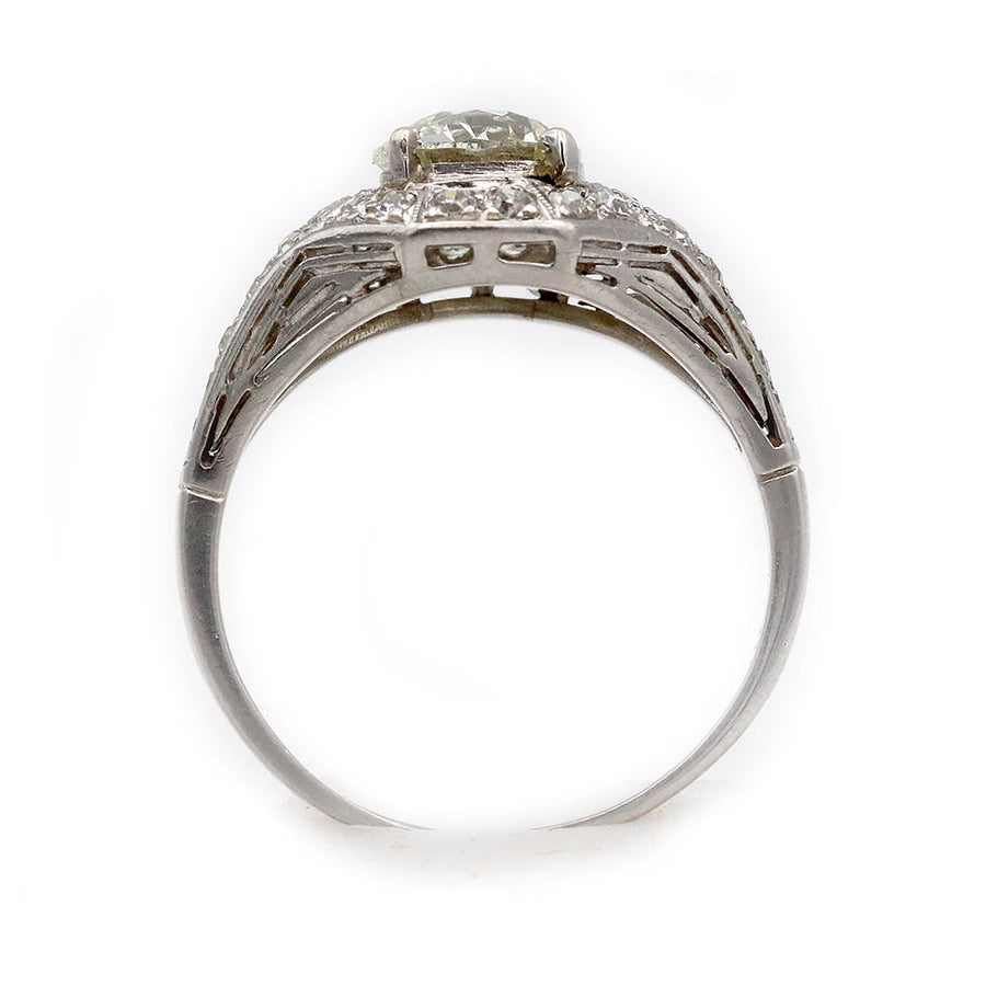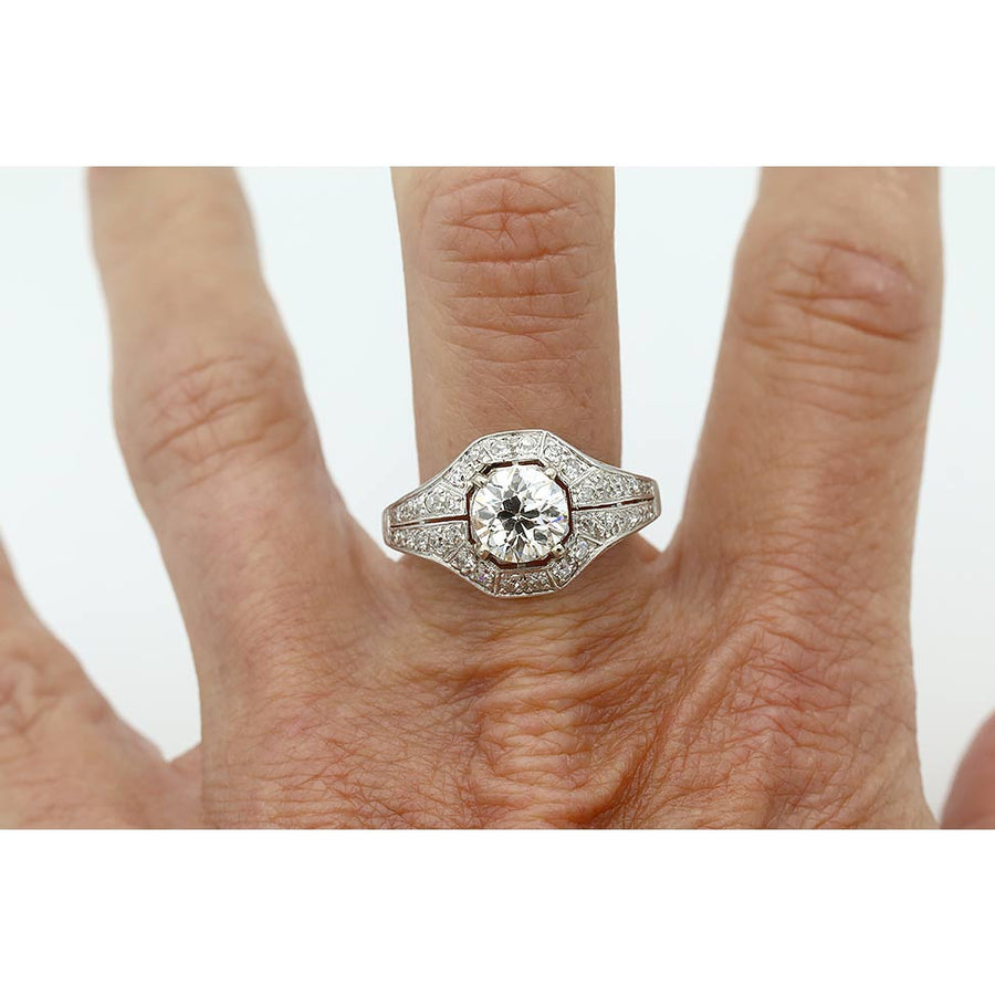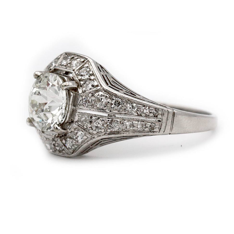 The Emi ring is an authentic vintage engagement ring from the Art Deco era, dating to the 1930s. It features a 1.48 ct GIA-certified old European cut diamond of K color and SI1 clarity, set within a distinctive geometric octagonal frame. The center stone is surrounded by thirty-six single cut diamond accents that add brilliance and symmetry. Handcrafted in platinum, the ring is finished with a delicate split shank and fine milgrain engravings characteristic of the Art Deco period. A showstopping vintage engagement ring, preserved in very good condition.