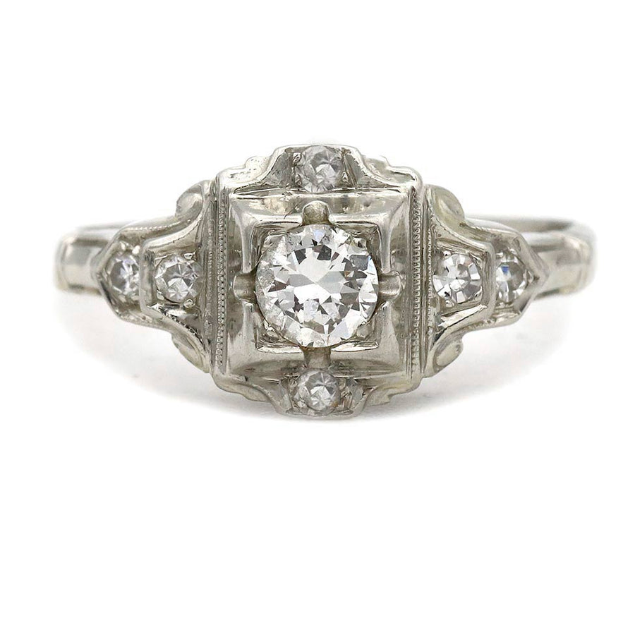 Take a trip back to Christmas 1933 with this timeless Art Deco delight we named Marcela. The Marcela ring is an authentic vintage diamond engagement ring featuring a .25 carat old European cut diamond of F color, VS1 clarity, residing in a geometric square frame. The diamond is surrounded by 6 single cut diamond accents. Beautifully handcrafted in 18kt white gold, completed with delicate filigree and milgrain engravings. A lovely engagement ring, in very good condition.