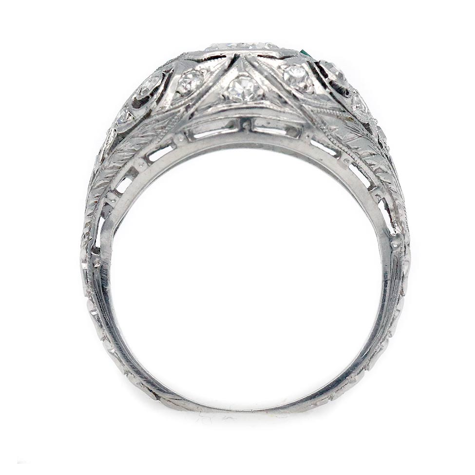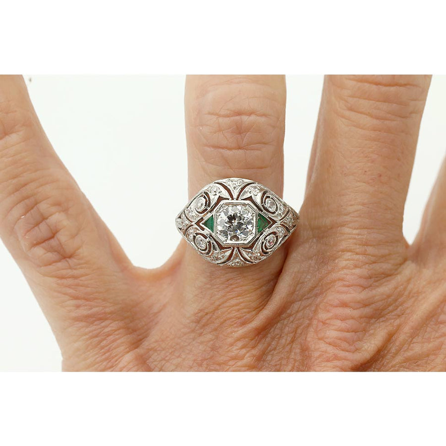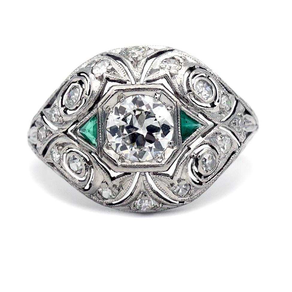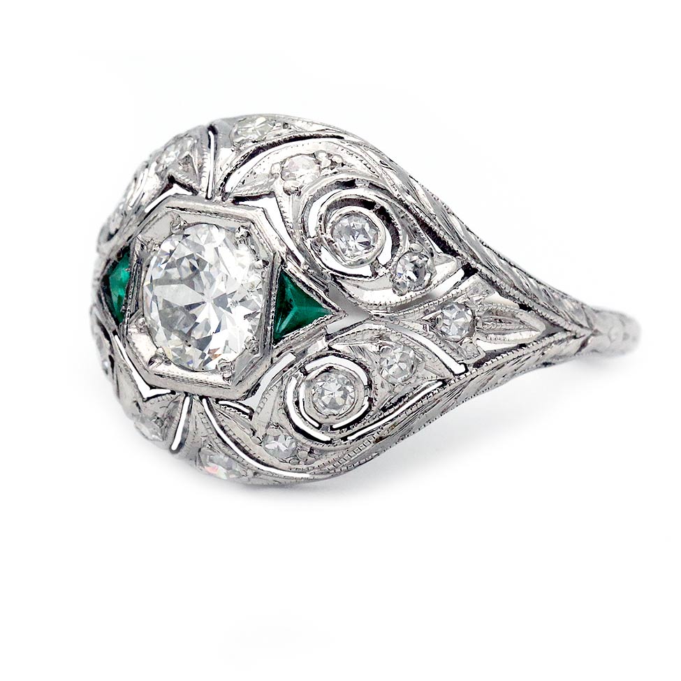 The Nina ring is an authentic vintage engagement ring from the Edwardian era, dating to the 1920s. It features a .70 carat old European cut diamond of I color and SI1 clarity, set within a crisp geometric octagonal frame. The center stone is flanked by two natural Colombian emerald triangles and accented by twenty single cut diamonds, creating a refined balance of color and brilliance. Handcrafted in platinum with swirling open metalwork, delicate filigree engraving, and fine milgrain detailing, this exceptional vintage engagement ring is preserved in very good condition.