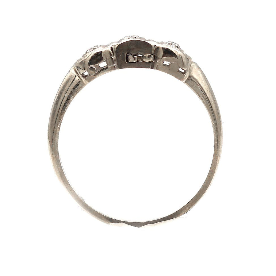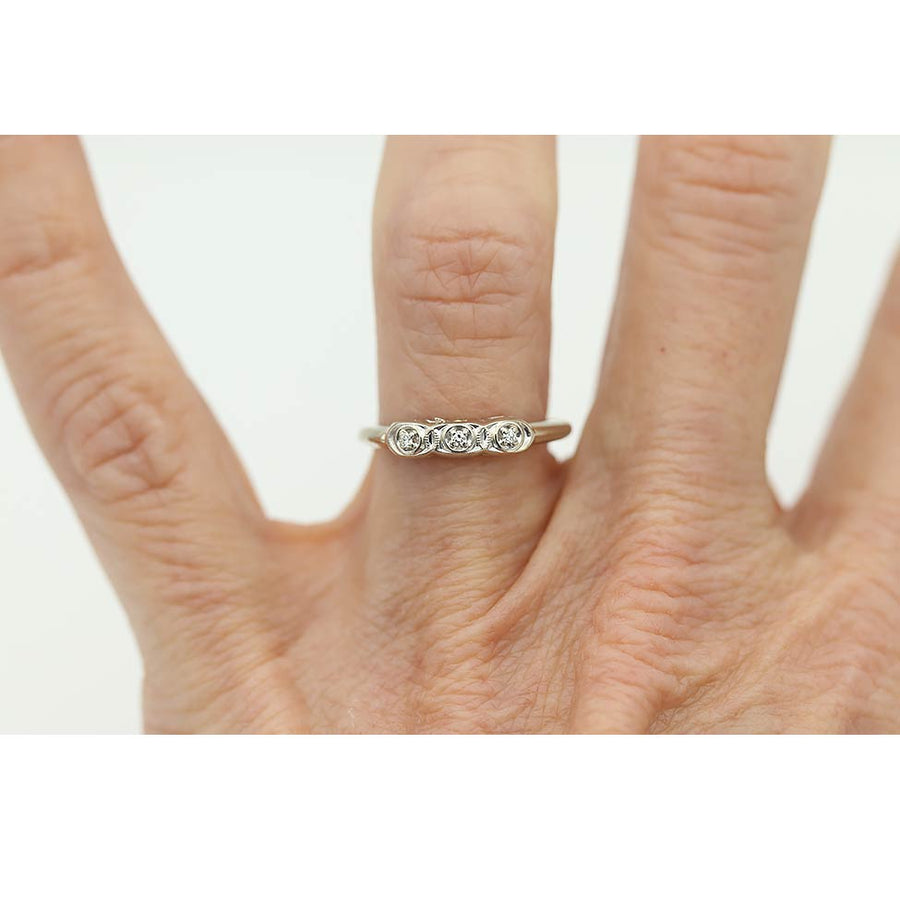 Lexa is a delicate vintage diamond wedding band featuring three (3) single cut diamonds, weighing .05 carat with F color, VS2 clarity. Crafted in 14 kt white gold circa 1950's. A perfect band to stack. In very good condition. This band measures 3.2 wide tapering to 2.1 and 1.2 at the bottom.