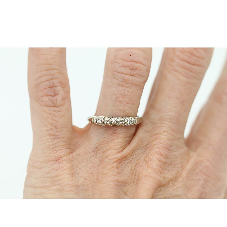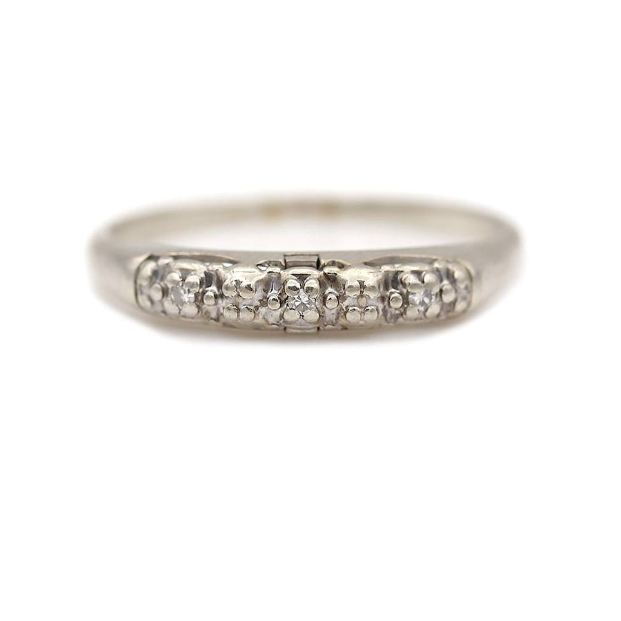 Rennie is a classic antique diamond wedding band featuring 3 single cut diamonds, weighing .05 carat with G color and VS2 clarity. Crafted in 14 kt white gold, in the 1950's, this is the perfect band to stack with other vintage wedding bands or to compliment your vintage engagement ring. In very good condition. The band measures 3.5 wide tapering to 2.95 and 1.4 at the bottom.
