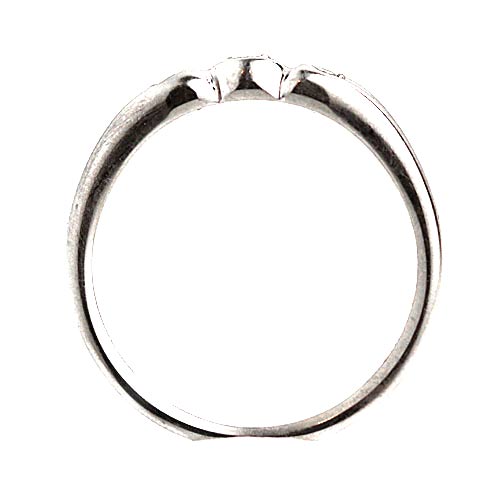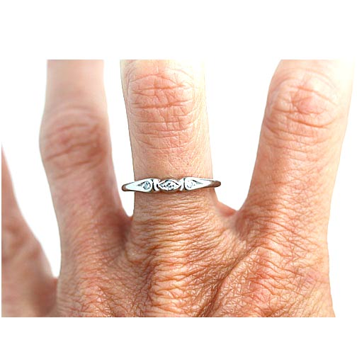 The Tene band is an authentic antique wedding band dating to the 1950s. It features three single cut diamonds of F color and VS2 clarity, totaling approximately .10 carat. Beautifully crafted in 18K white gold, the band is finished with elegant navette-style engravings that give it a delicate, elongated look. Sweet and refined in design, this vintage band is signed and stamped Jabel,”. Perfect for stacking with other bands or wearing on its own, preserved in very good vintage condition.