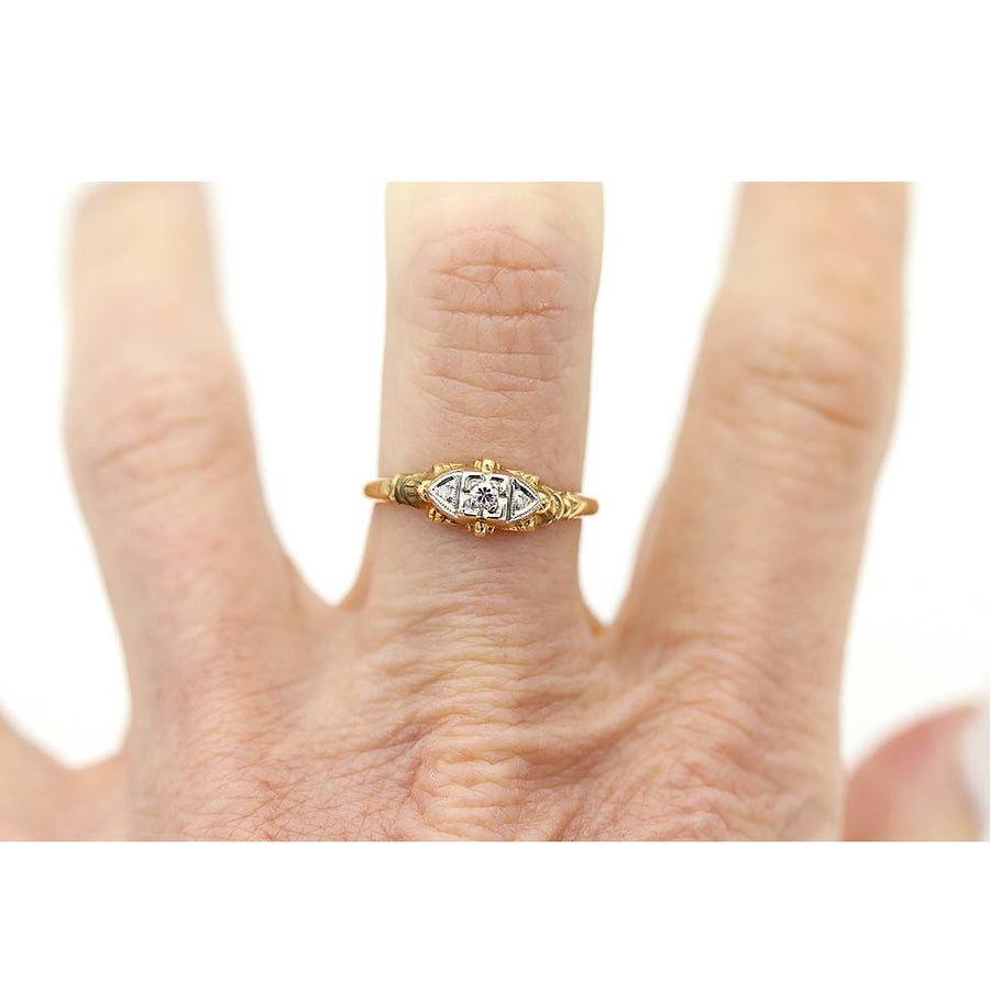 The Ami ring is an authentic vintage engagement ring circa 1940s. The ring boasts a bright-white .15 carat old European cut diamond of F color, VS2 clarity. The diamond is flanked by 2 single cut diamond accents residing in a triangular set milgrain frame. Beautifully crafted in 14 karat two tone gold, white white gold atop a rose gold setting. A sweet delicate ring that will pair perfectly with a vintage band. In very good condition.