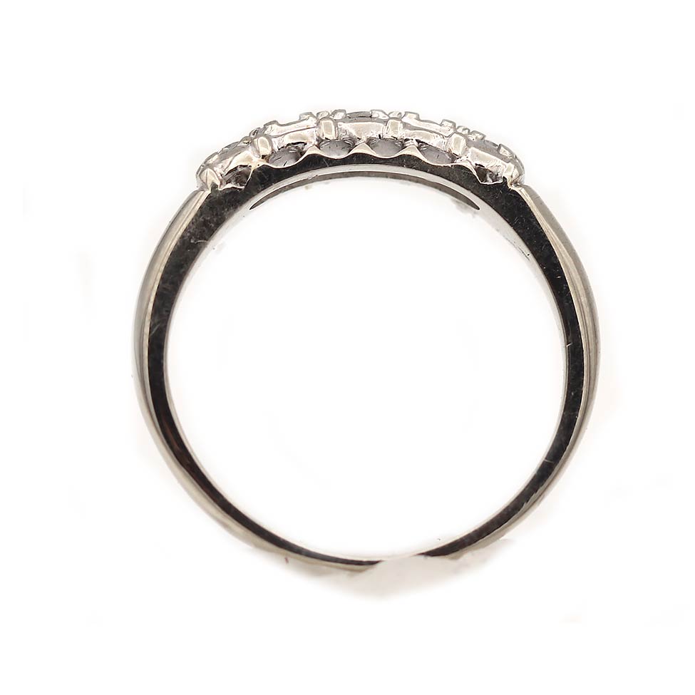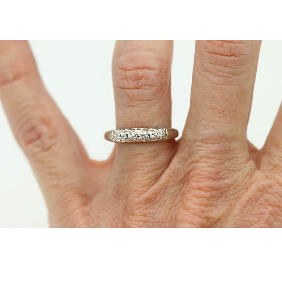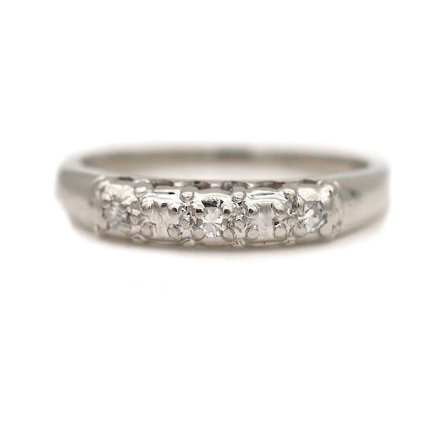 Zendatta is an authentic estate wedding band featuring 3 bright-white single cut diamonds, weighing .10 carat (F color and VS2 clarity). Crafted in 14k white gold, in the 1950's, and stamped Lovello, this is the perfect band to stack with your vintage engagement ring. In very good condition. The band measures 3.7 wide tapering to 3.4 and 1.35 at the bottom.