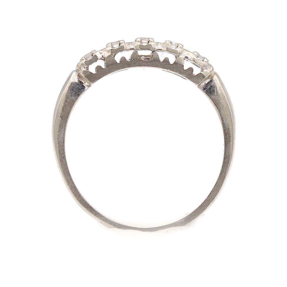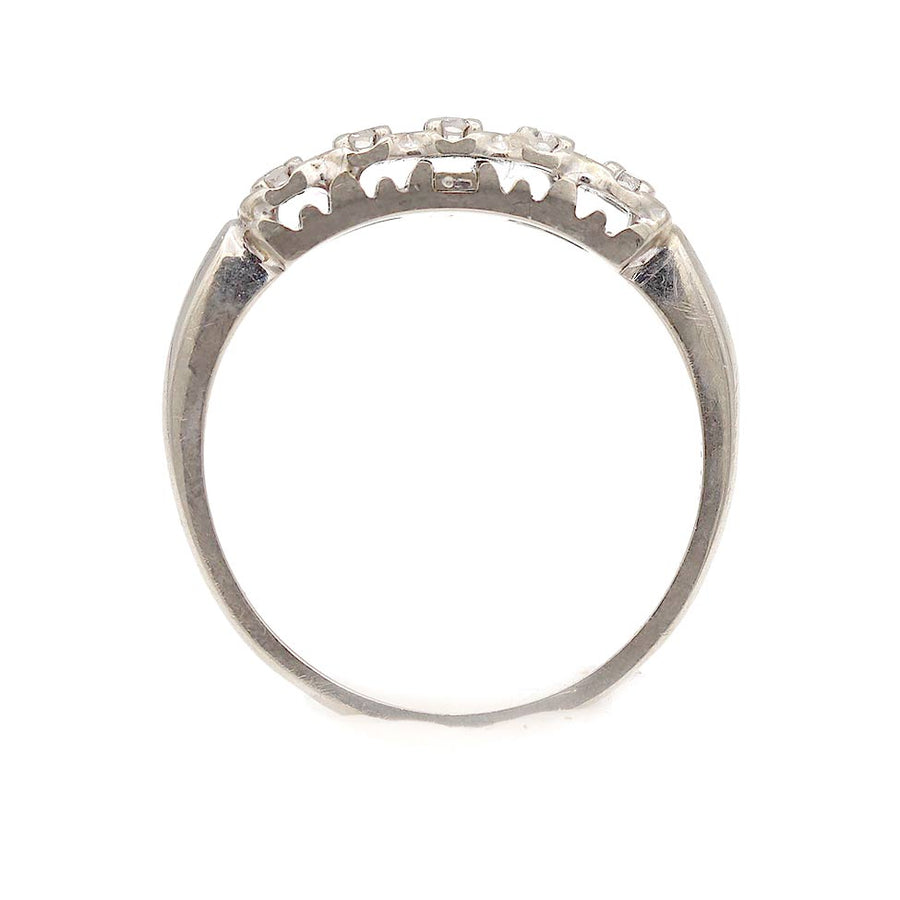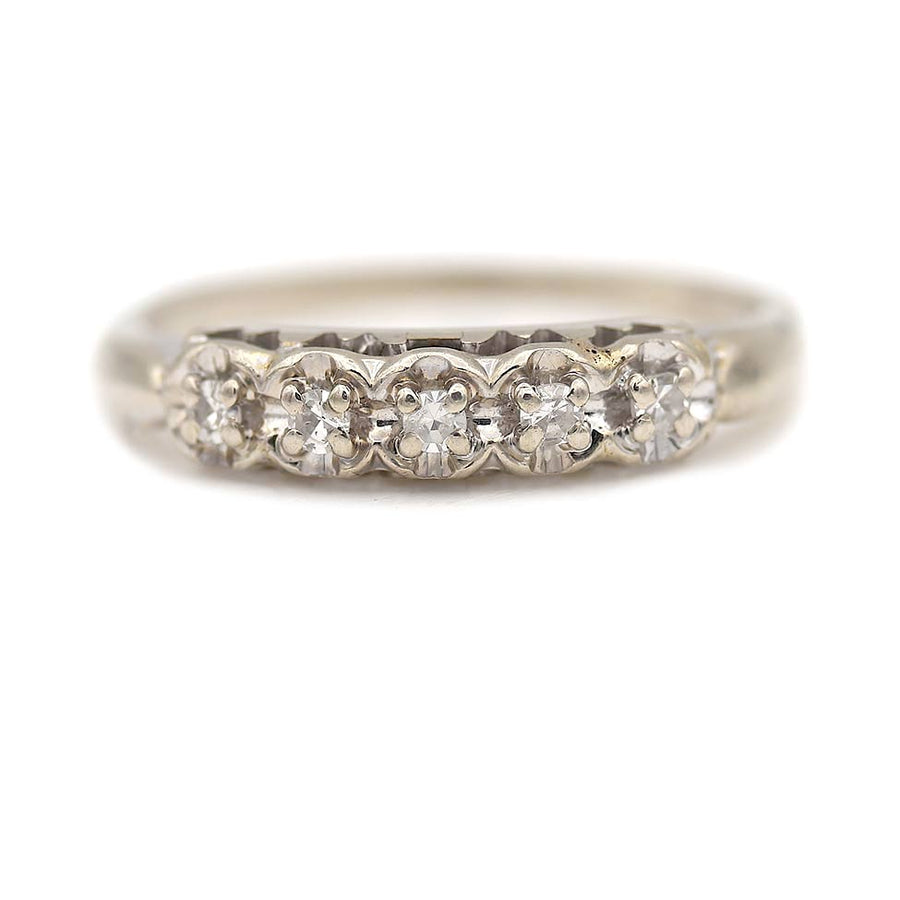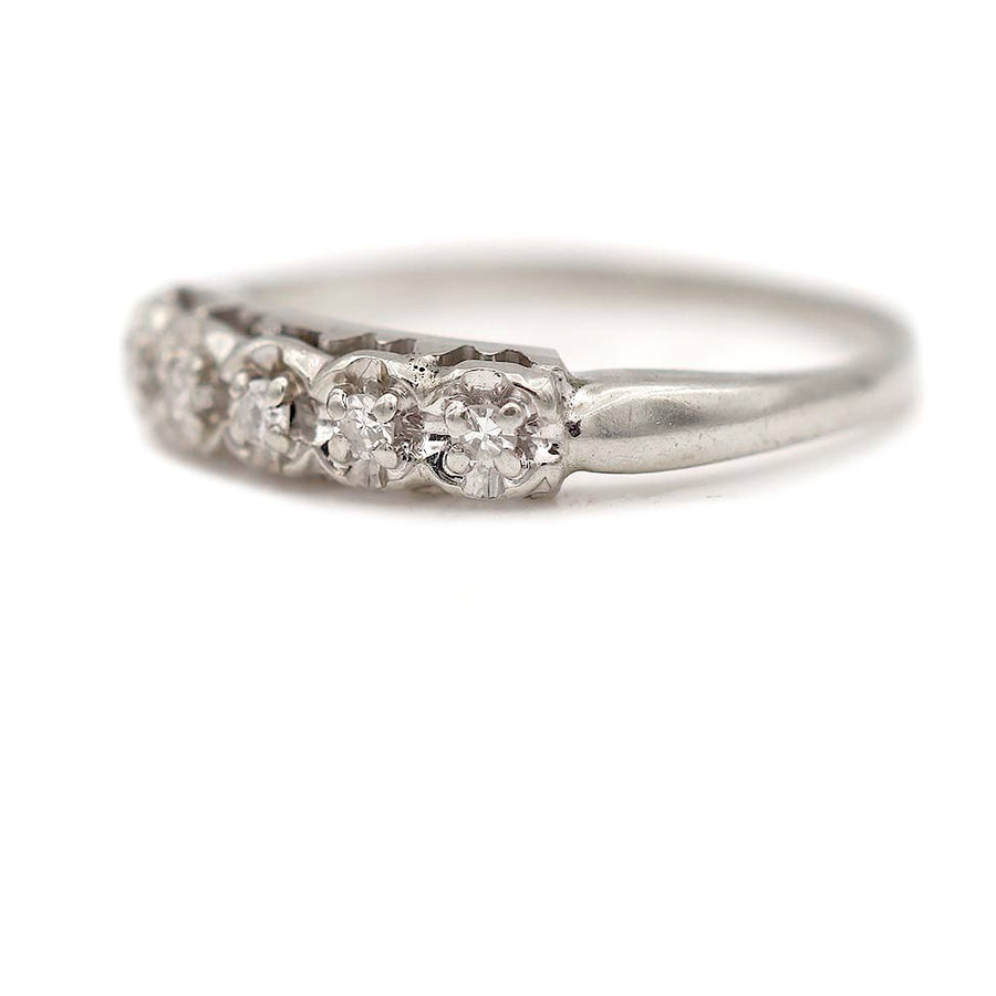 Astrid Z is a timeless antique wedding band featuring 5 glittering single cut diamonds, weighing .15 carat with H color and SI1 clarity. Crafted in 14 kt white gold, during the 1950's, this is a perfect band to stack with other vintage wedding bands. In very good condition. The band measures 3.6 wide tapering to 2.3 and .85 at the bottom.