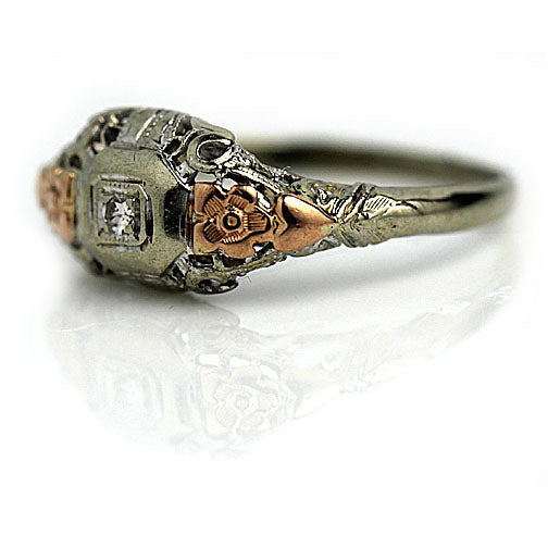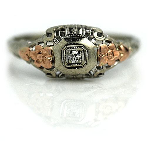 The Paula ring is an authentic vintage engagement ring circa 1940's. The ring features a .05 carat single cut diamond of F color, VS2 clarity, residing in a two-tier octagonal frame. The diamond is flanked by two gleaming 10 karat rose gold florets. Crafted in 10 karat white gold, completed with open metal work and milgrain engravings. A delightful vintage ring. We love the contrast of rose and white gold. In very good condition.