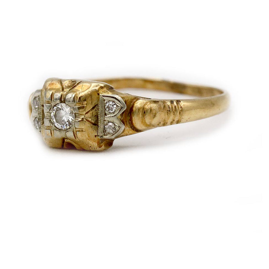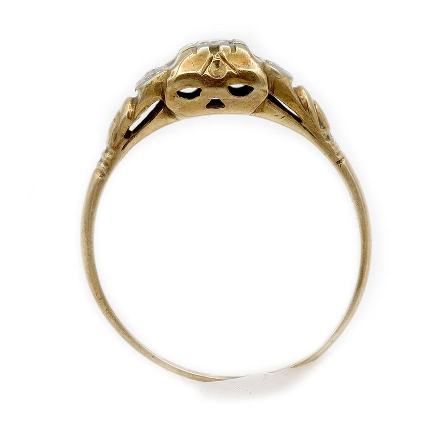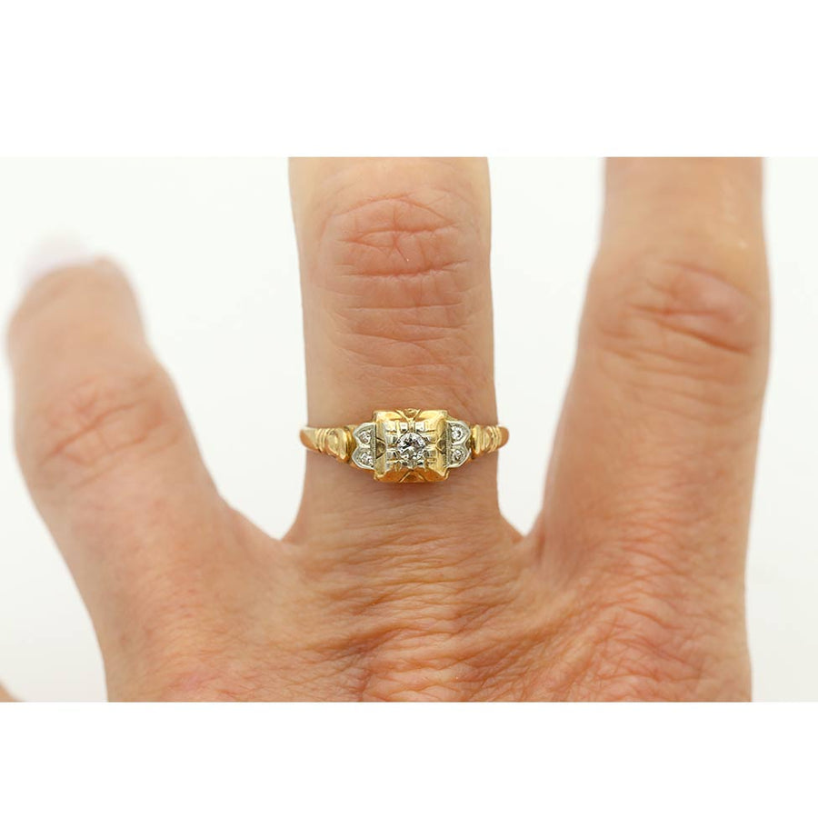 The Anna B ring is an authentic vintage diamond ring circa 1940's. The ring boasts a bright white .10 carat old European-cut diamond of H color, SI1 clarity. The diamond is flanked by 4 side single cut diamond accents. Handcrafted in 14 karat two tone gold, white gold atop a yellow gold ring, beautifully finished with delicate engravings. A sweet vintage ring, with a beautiful contrast of yellow and white gold. In very good condition.