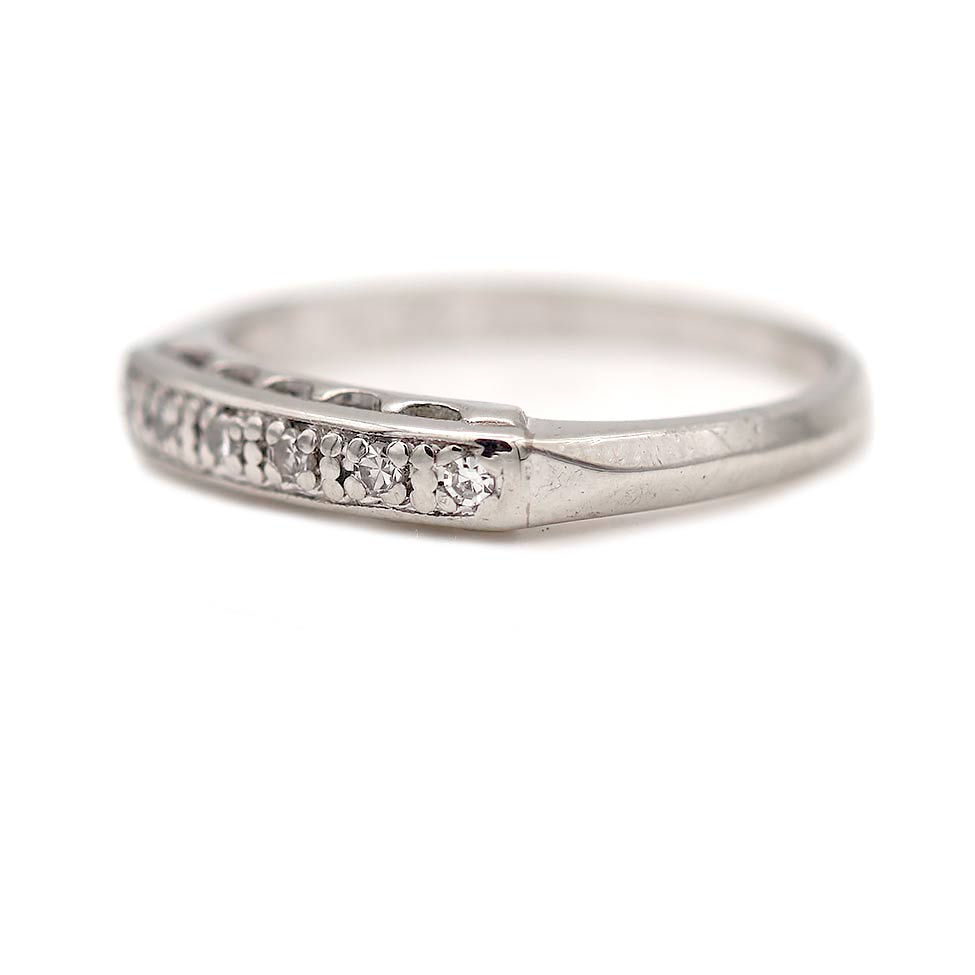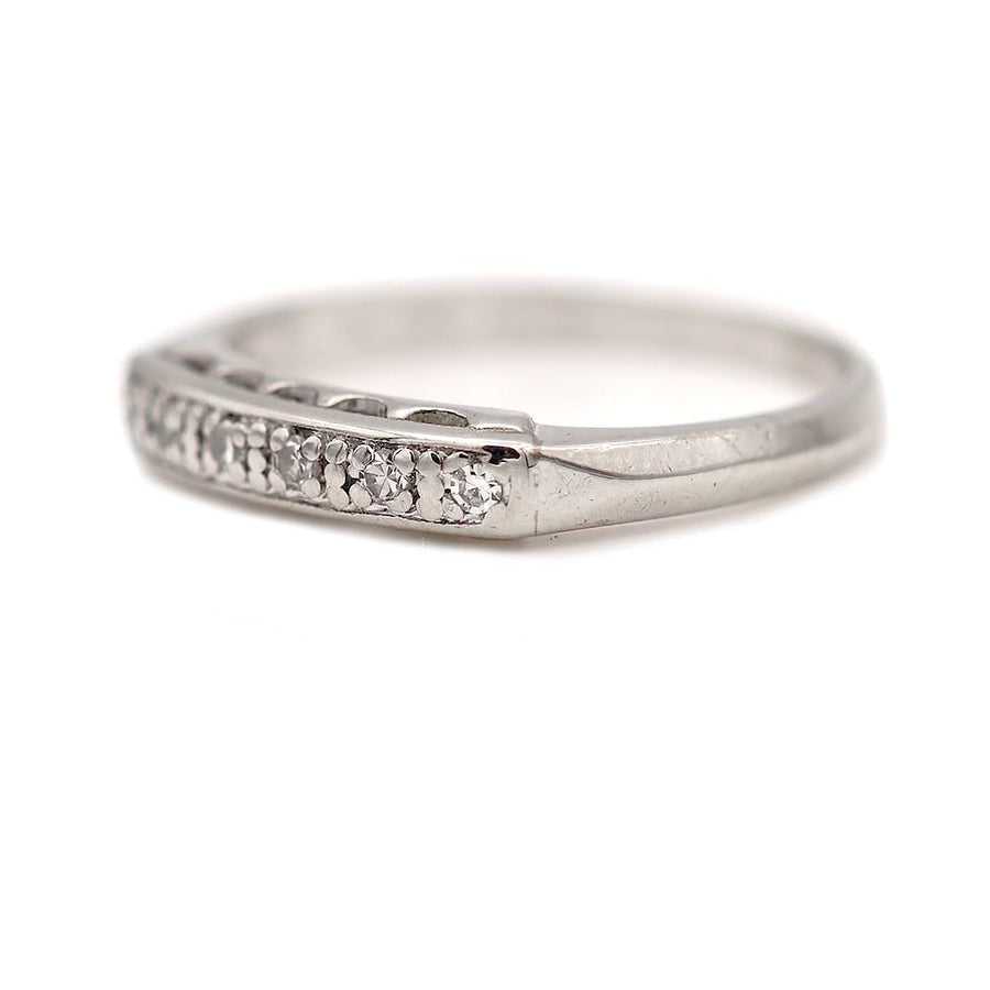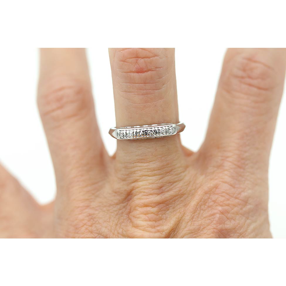 Netalia is a classic and authentic vintage wedding ring featuring 6 bright-white single cut diamonds, weighing .15 carat with G color and VS2 clarity. Crafted in platinum, in the 1950's, this is the perfect compliment for your vintage engagement ring, or you can stack with other wedding bands. In very good condition, this band measures 2.9 wide tapering to 2.6 and 1.72 at the bottom. In very good condition.