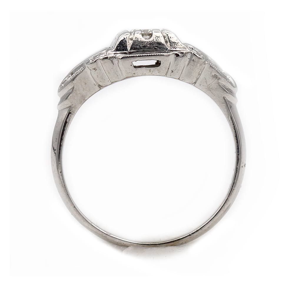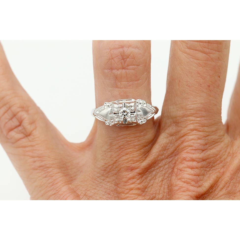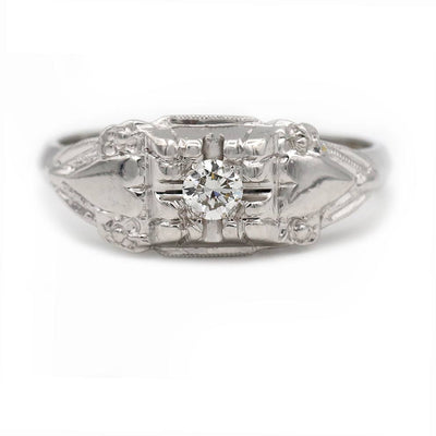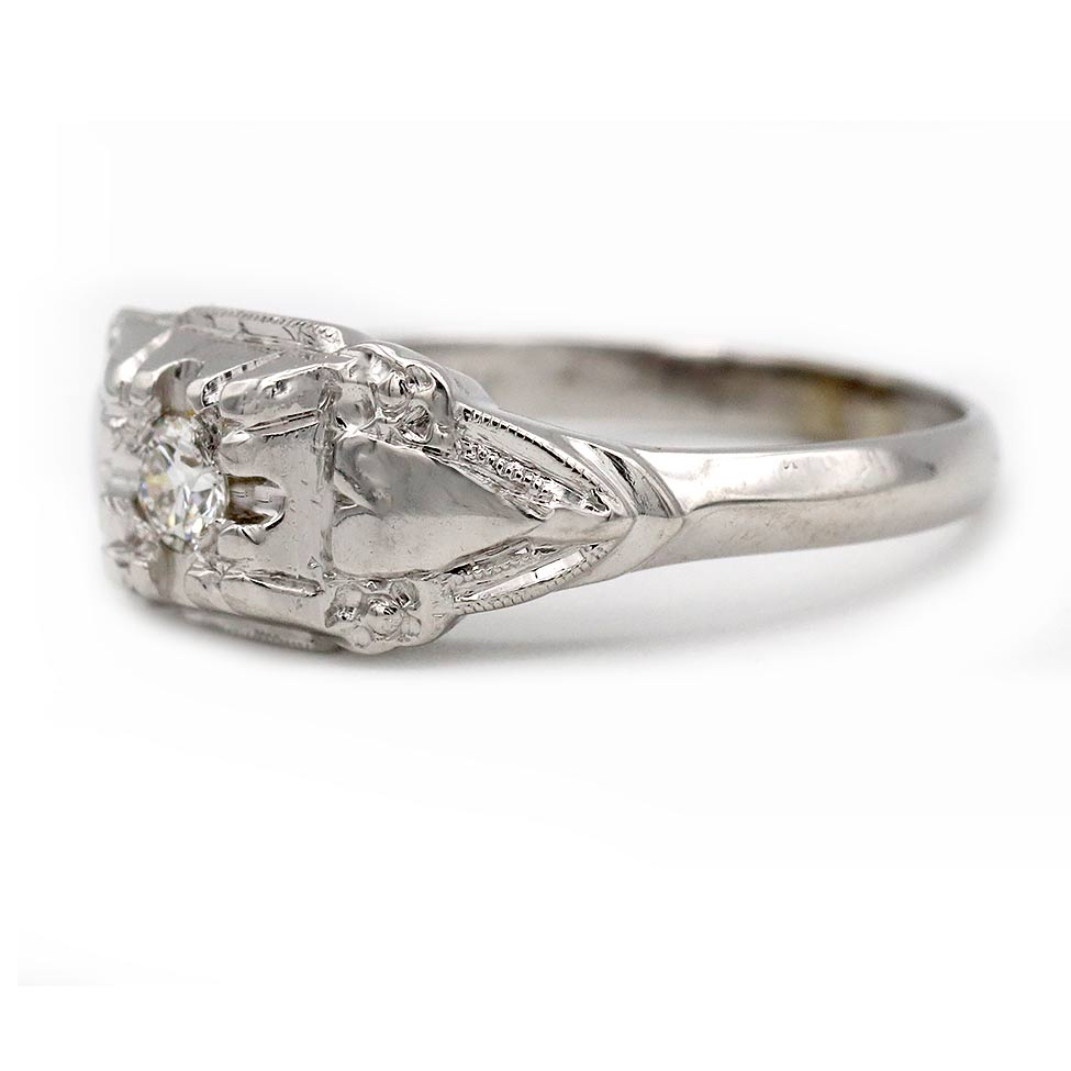 The Laurie ring is an authentic antique diamond engagement ring from the Art Deco era circa 1930's. The ring features a .15 carat transitional cut diamond of I color, VS2 clarity, flanked by a pair of filigree hearts. Crafted in 14 karat white gold, accentuated with delicate milgrain engravings. A sweet, lovely vintage piece. In pristine condition. Your partners heart will always belong to you!