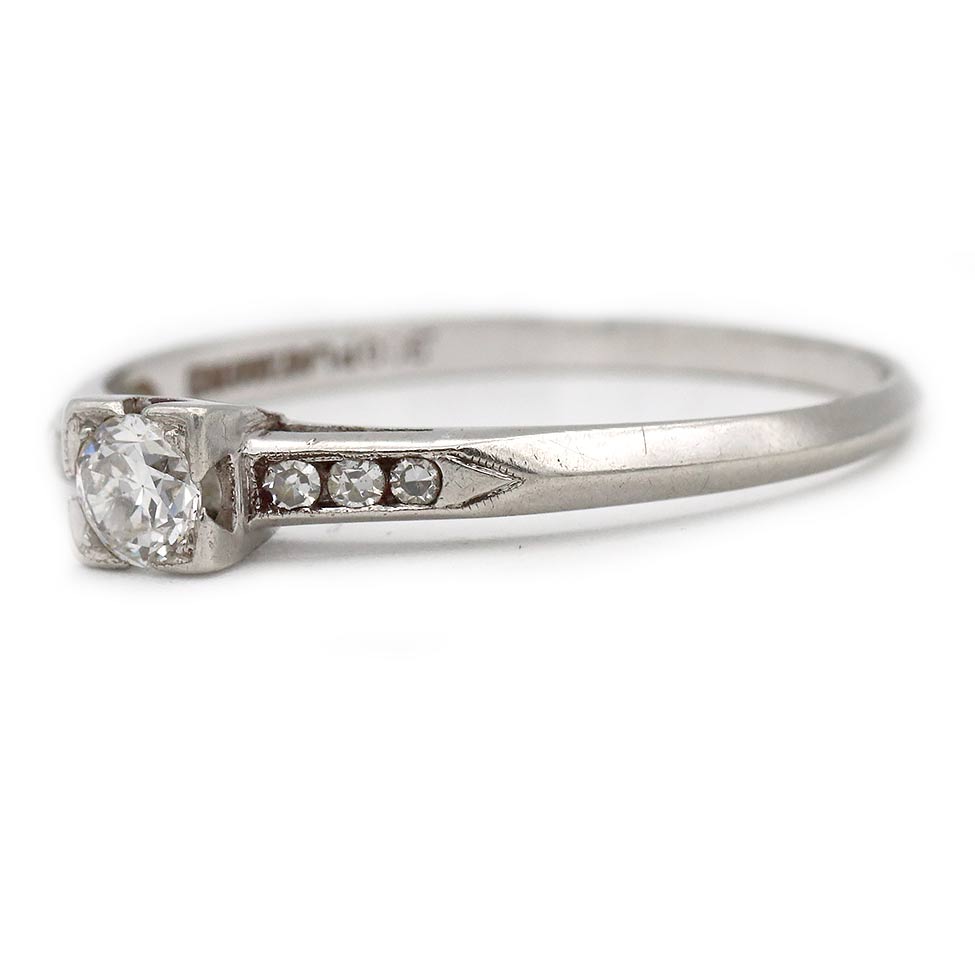 The Allison S ring is an authentic antique diamond engagement ring circa 1940's. The ring showcases a bright-white .25 carat old European-cut diamond of G color, VS2 clarity, residing in a geometric square frame. The diamond is flanked by 6 channel set single cut diamond accents. Crafted in platinum (with a makers mark PB signature), completed with linear engravings. A classic 1940's ring. In very good condition.