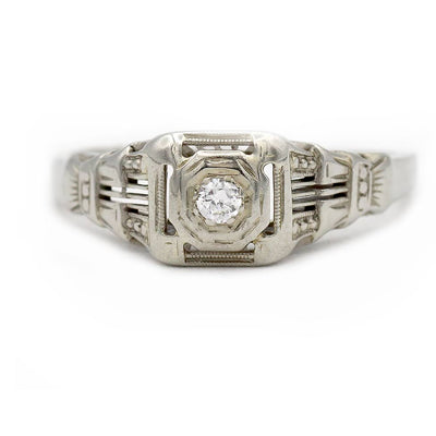 The Pina ring is an authentic vintage diamond engagement ring circa 1920's. The ring features a .10 carat old European cut diamond of E color, VS2 clarity, residing in a geometric octagonal frame. Crafted in 18 karat white gold, completed with open metal work and milgrain engravings. A delightful vintage ring. In good condition.