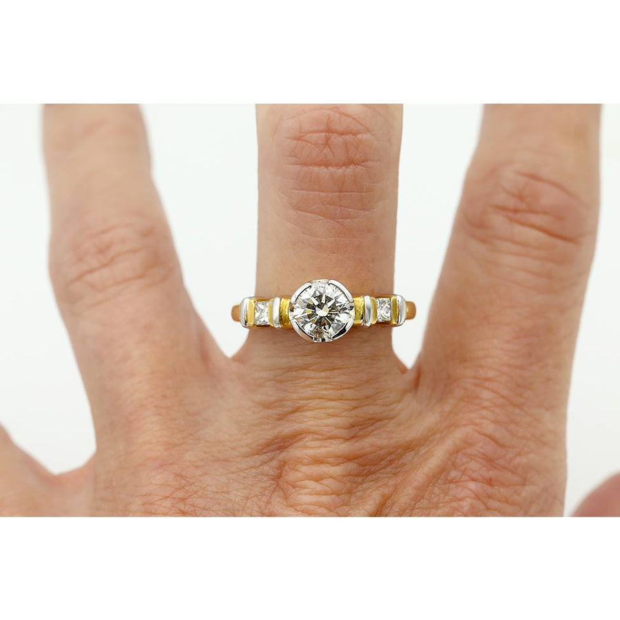 The Avi ring is an authentic vintage diamond engagement ring dating to the 1980s. It features an AGI-certified bezel-set round brilliant diamond weighing 1.01 carats, graded G color and SI2 clarity. The center stone is accented by two princess cut diamond side stones that add clean lines and modern contrast. Crafted in interchanging 14K white and yellow gold, the design reflects the bold, sleek style of the era. A striking vintage engagement ring with strong presence, preserved in very good vintage condition.