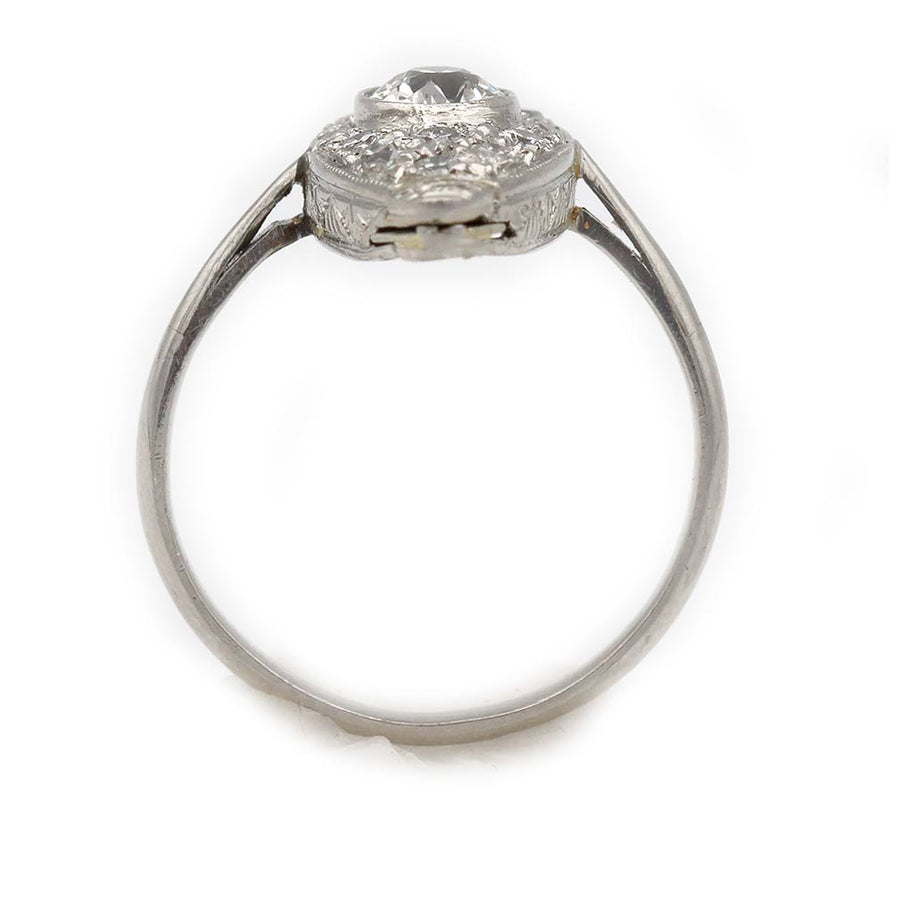 The Amelie ring is an authentic antique diamond dinner ring from the the Art Deco era circa 1940s. The ring showcases a bright-white .50 carat bezel set old European cut diamond of G color, VS2 clarity. The diamond is surrounded by 14 glittering old European cut diamond accents. Handcrafted in platinum, accentuated with delicate milgrain engravings and filigree around the base of the ring. A slender and elegant ring. Perfect to wear on either hand. In excellent condition.