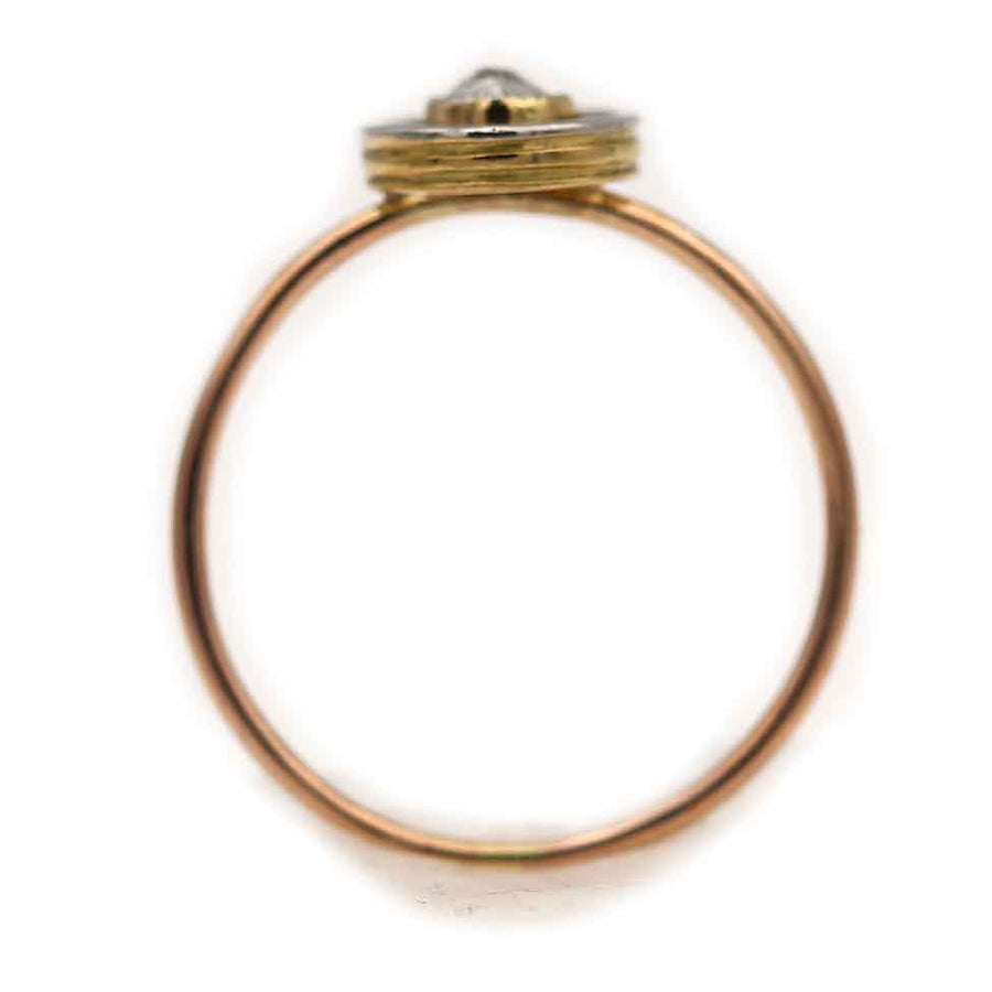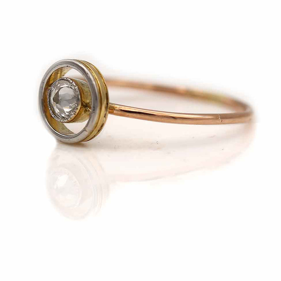 The Wiltoney ring is an authentic estate diamond engagement ring, circa 1900s, featuring a bezel set .25 rose cut diamond residing in a delicate halo. Crafted in 14 kt two tone gold, this is a sweet dainty piece. In good condition.