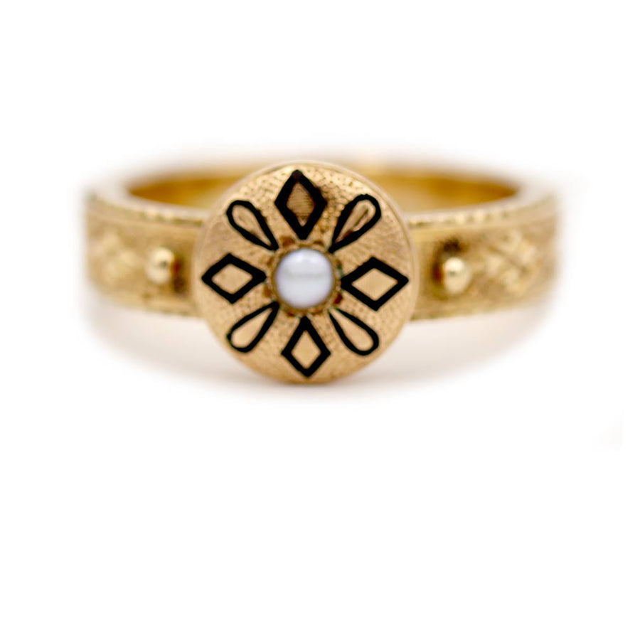 The Lulla ring is an authentic antique Georgian mourning ring, circa 1800s. This ring features a center natural seed pearl surrounded by delicate onyx enamel engravings. Beautifully crafted in 9 kt yellow gold and accentuated with delicate filigree engravings. A gorgeous Georgian ring. They don't come any finer, and very hard to find. In very good condition.