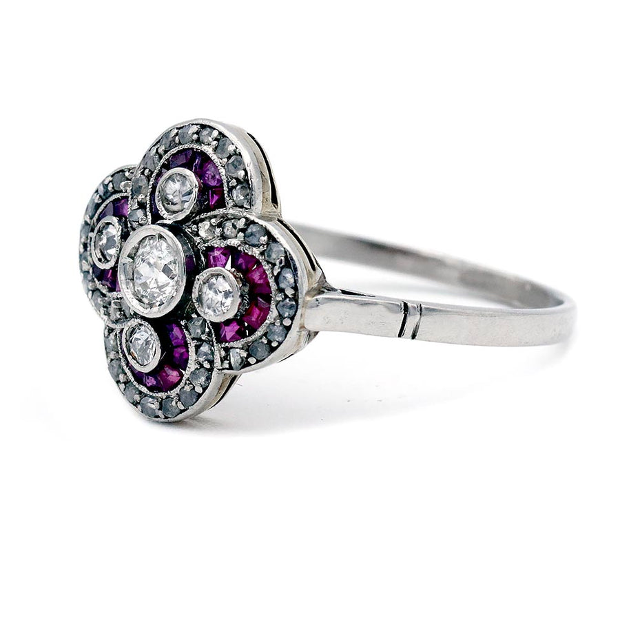 The Illyich ring is an authentic Art Deco ruby engagement ring circa 1920s. This ring features a bright-white .10 carat old mine cut diamond surrounded by a delicate halo of four (4) mine cut diamonds, 23 natural antique square Burma rubies and thirty six (36) rose cut diamond accents. Beautifully crafted in platinum. A beautiful Art Deco piece,  and in good condition.