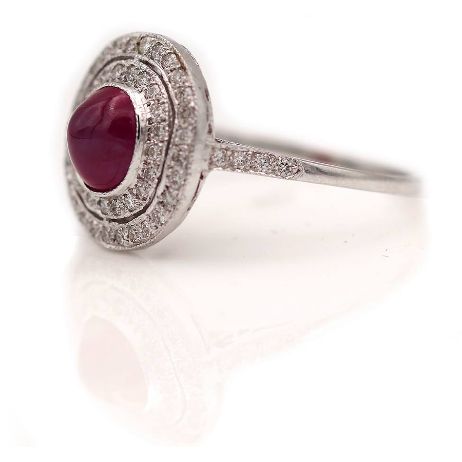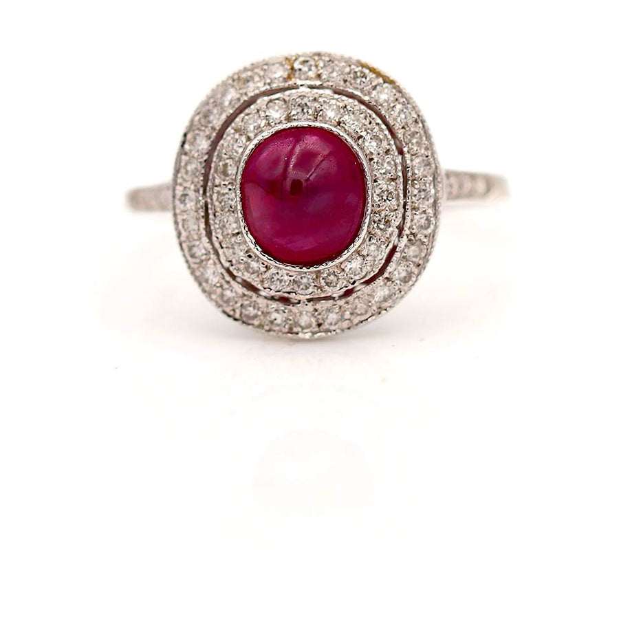 Estate Ruby Cabochon Two-Tiered Diamond Halo Engagement Ring