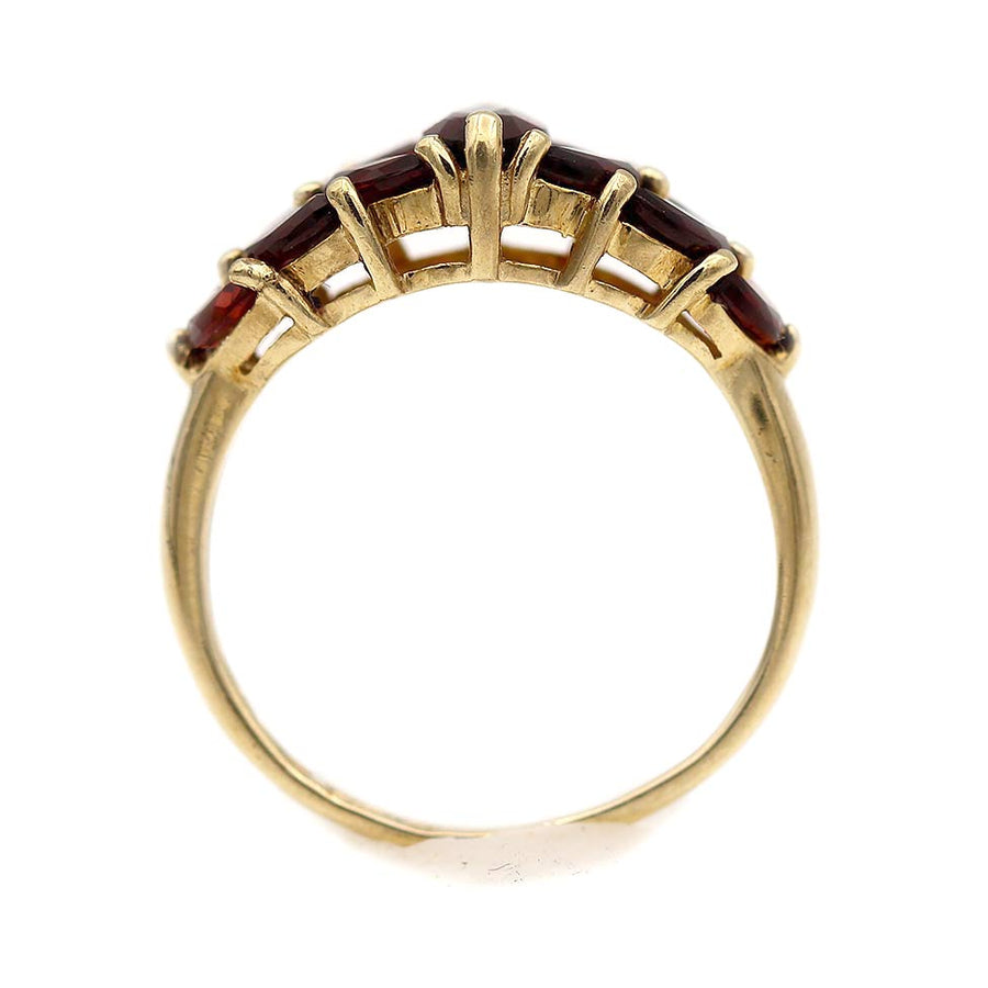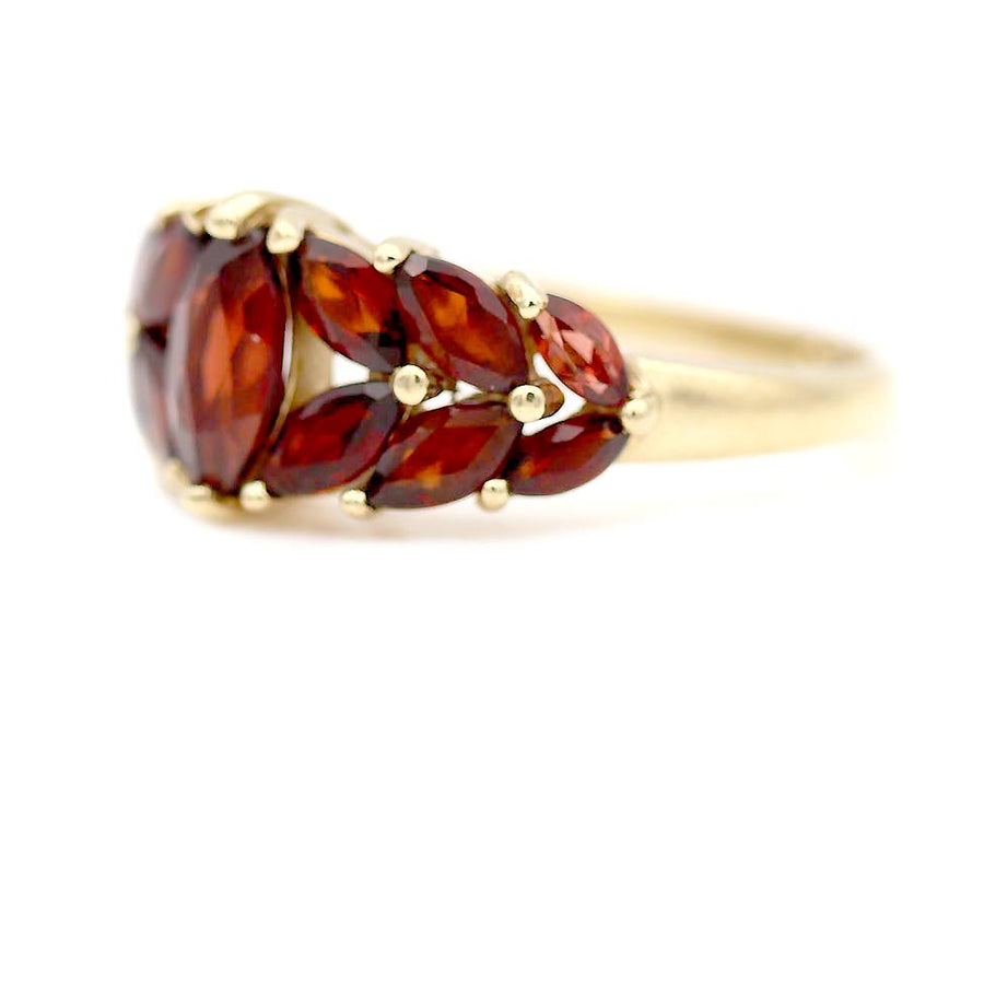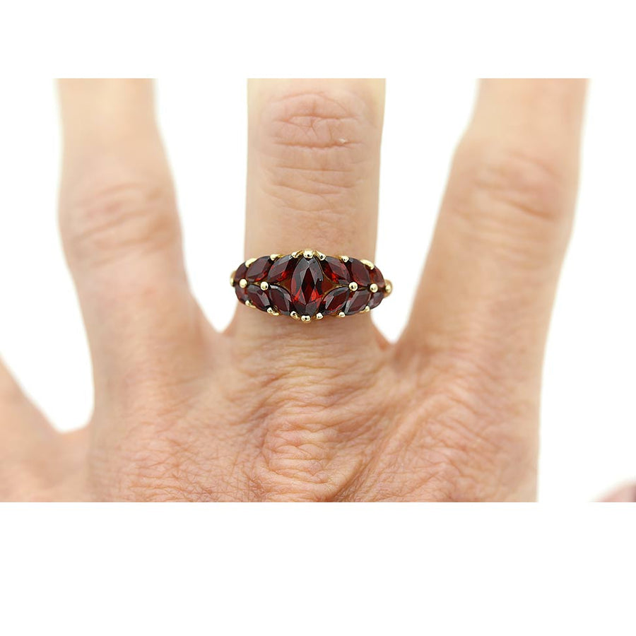 The Marney ring is a lovely 1900s Victorian gemstone ring featuring a natural .40 carat marquise garnet flanked by twelve (12) natural marquise garnets weighing 1.20 ctw. Beautifully crafted in 10 kt yellow gold, this ring measures 9.1 mm, tapering to 3.0 and 1.6 thick at the base of the shank. A lovely gemstone ring, perfect to wear on either hand. In very good condition.