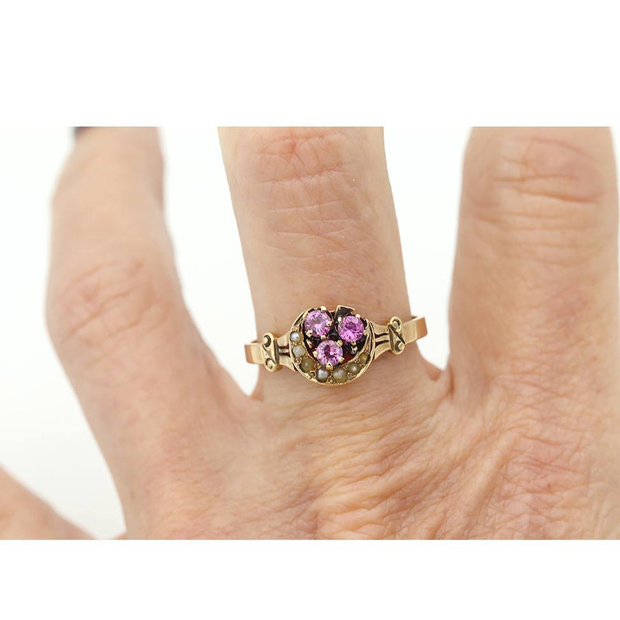The Coleman ring is an authentic Victorian pink sapphire engagement ring from the early 1900s. It features three natural pink sapphires, weighing approximately 0.60 carats total, framed by seven original seed pearls. Set on a delicate split shank and handcrafted in 10K rose gold, the ring is finished with fine milgrain and intricate filigree engraving. A softly detailed Victorian gemstone ring, offered in very good vintage condition.