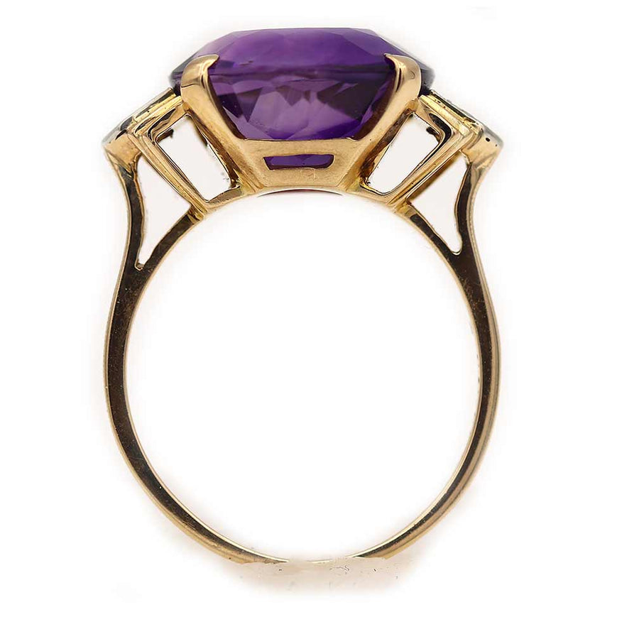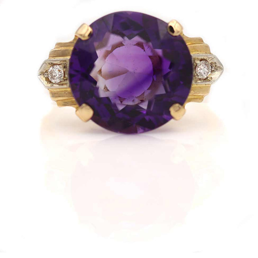 The Palmer ring is an authentic Victorian amethyst engagement ring, circa 1900s, featuring a natural, deep purple, round cut amethyst weighing approximately 5.01 carat. This amethyst is flanked by two (2) mine cut diamond accents, all beautifully crafted in 14 kt yellow gold and accentuated with delicate milgrain and filigree engravings. A lovely non- diamond jewel from the Victorian era. In very good condition.