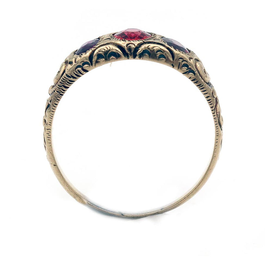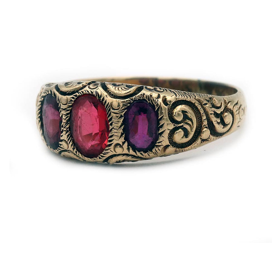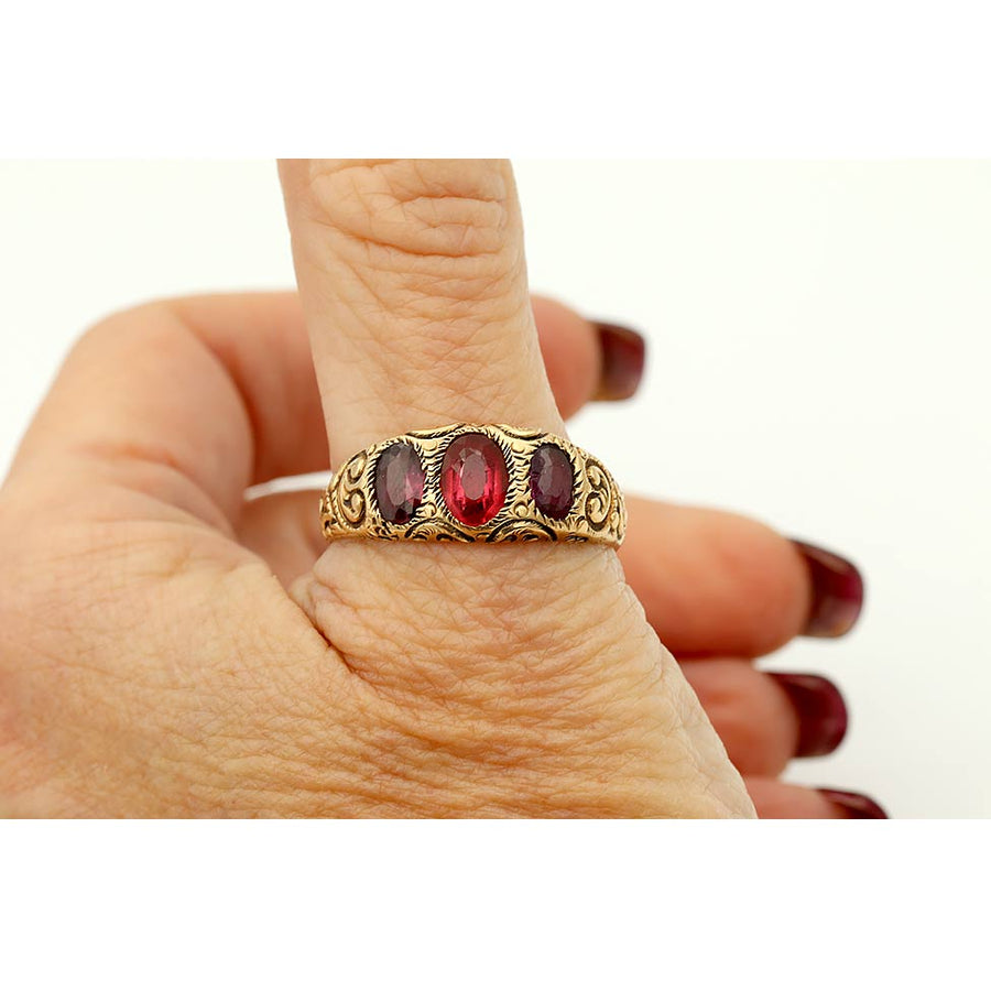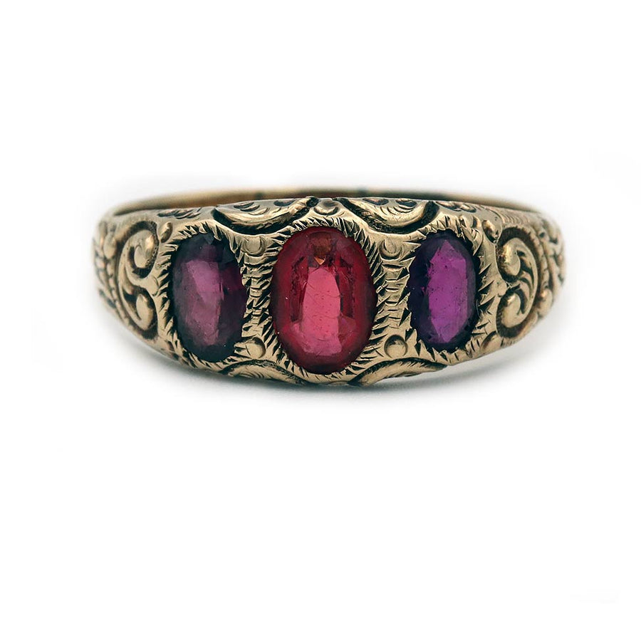 The Bellinni ring is an authentic Victorian three stone garnet engagement ring from the early 1900s. It features a 1.00 ct oval-cut red garnet doublet at the center, flanked by two purple doublet side stones. Handcrafted in 10 karat rose gold, the ring is beautifully detailed with intricate filigree engravings. A striking Victorian piece, offered in very good vintage condition.