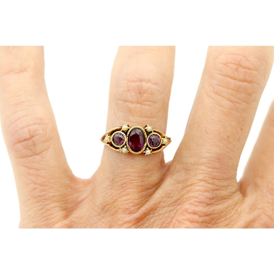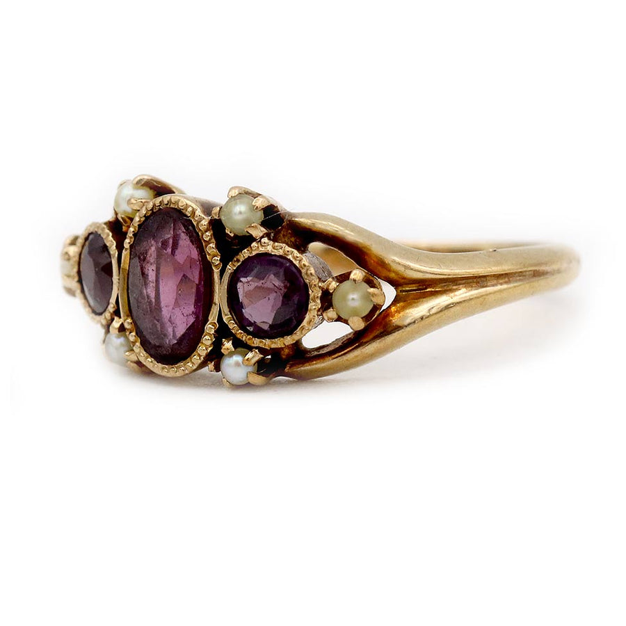 Victorian Purple Garnet & Pearl Three Stone Engagement Ring | Circa 1900s