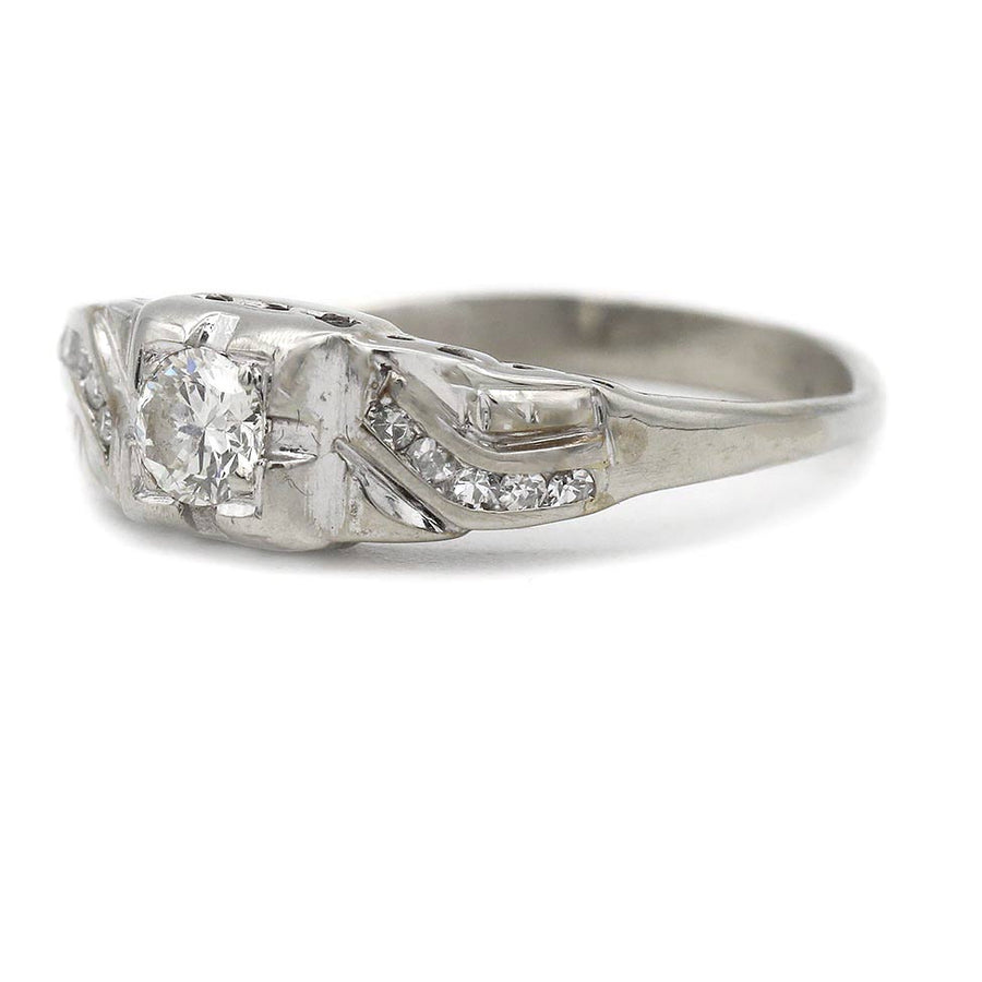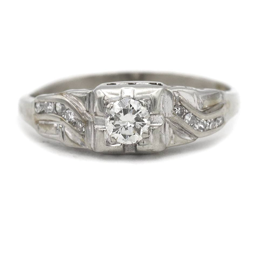 The Regine ring is an authentic vintage diamond ring circa 1930s. The ring features a .30 carat old European cut diamond of G color, VS2 clarity, residing within a geometric square frame. The diamond is flanked by 10 asymmetric channel set single cut diamond accents. Crafted in 14 karat white gold, accentuated with linear engravings and an open work gallery. A sweet engagement ring with a distinct vintage feel! In good condition.