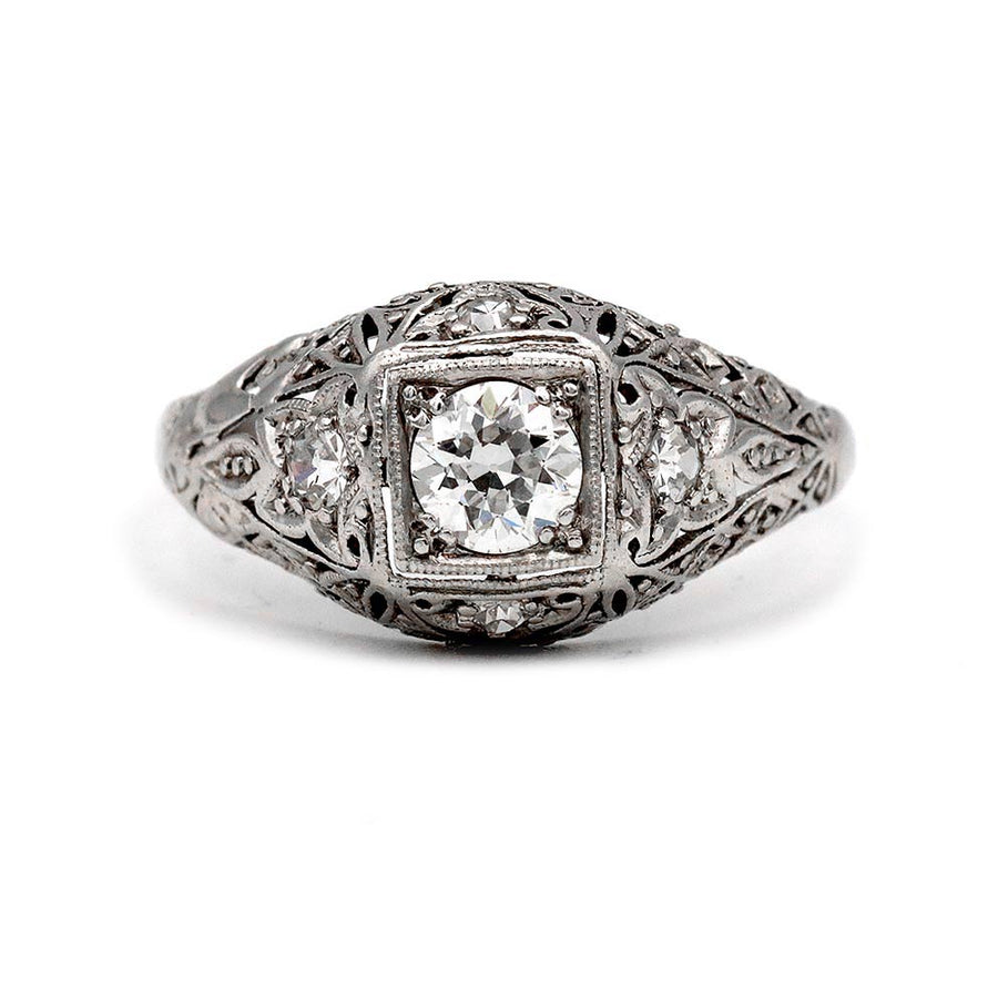The Corinne ring is a magnificent and authentic antique engagement ring from the Art Deco era circa 1930's. The ring showcases a .35 carat old European cut diamond of H color, VS2 clarity, residing within a geometric square milgrain frame. The diamond is surrounded by 4 twinkling single cut diamond accents. Beautifully hand crafted in in platinum, accentuated with open metal work and intricate filigree engravings. A sweet, piece, in good condition.
