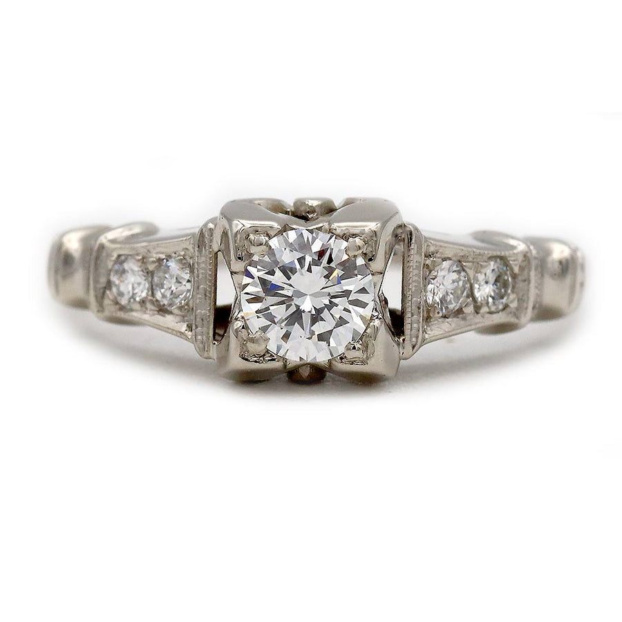 The Harper ring is an authentic vintage engagement ring circa 1940s. The ring features a glittering .35 carat old transitional cut diamond of F color, VS2 clarity. The diamond is flanked by 4 prong set transitional cut diamond accents. Beautifully handcrafted in the 18 karat white gold, accentuated with exquisite milgrain engravings. Simply a lovely vintage ring, in very good condition.
