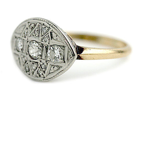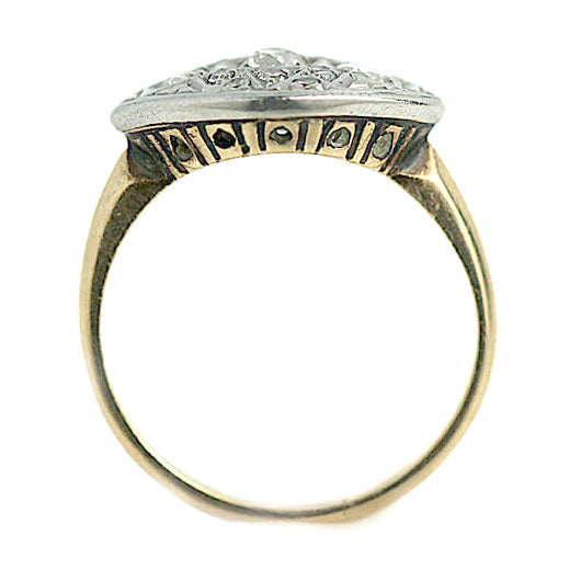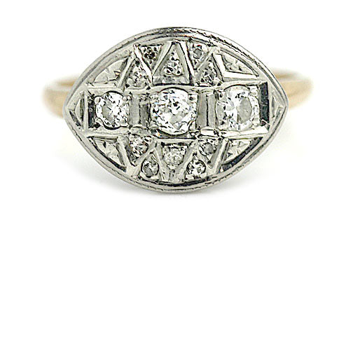 The Tessie ring is an authentic vintage old European cut diamond navette cocktail ring circa 1940's. The ring features three dazzling old European-cut diamonds. The diamonds are surrounded by 8 single cut diamond accents, residing in triangular filigree frames. Crafted in two tone gold, 10 karat white gold atop a 14 karat yellow gold ring, accentuated with filigree engravings. A cool, sleek cocktail ring that is perfect for your left or right hand. In very good condition.