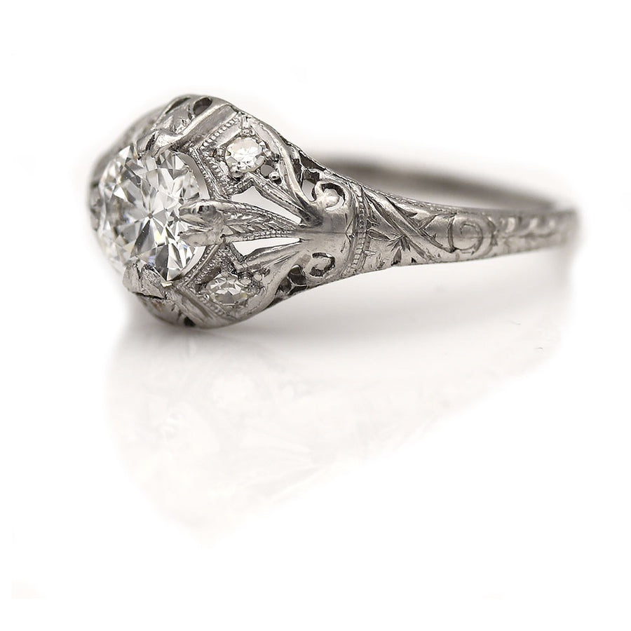 The Glenda ring is an authentic antique engagement from the Art Deco-era circa 1920's. The ring features a dazzling GIA certified .66 carat old European cut diamond of F color, VS2 clarity. The diamond is surrounded by 4 single cut diamond accents. Beautifully handcrafted in platinum, accentuated with intricate swirls of metal work and filigree engravings. An Art Deco treasure, in pristine condition.