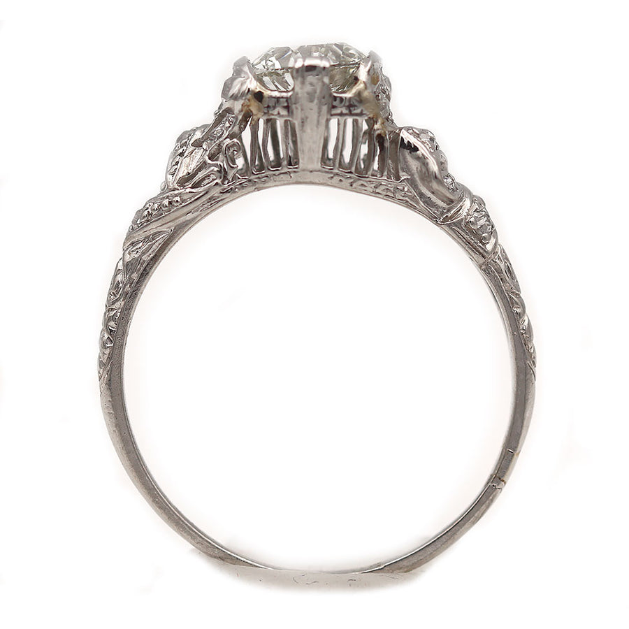 The Darcey ring is an authentic vintage diamond engagement ring from the Art Deco era, showcasing a GIA certified 1.02 carat old European cut diamond of K color, SI1 clarity. The diamond is flanked by 14 single cut diamond accents. Beautifully crafted in platinum, accentuated with open metal work and delicate filigree engravings. A superb ring with a vibrant original antique diamond! In good condition.