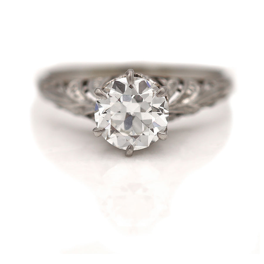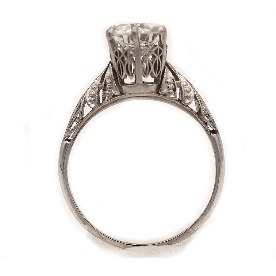 The Consolata ring is an authentic vintage engagement ring from the Art Deco Era circa 1930's. The ring showcases a GIA certified 1.17 carat old European cut diamond of I color, VS2 clarity. The diamond stands tall and proud in a platinum hand crafted setting, accentuated with open metal work and filigree engravings. A consummate and timeless Art Deco piece! In excellent condition.