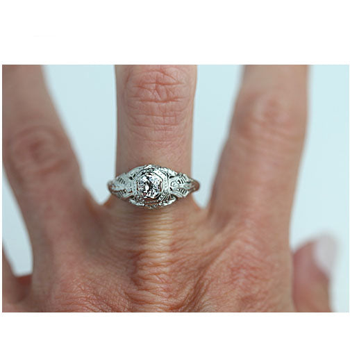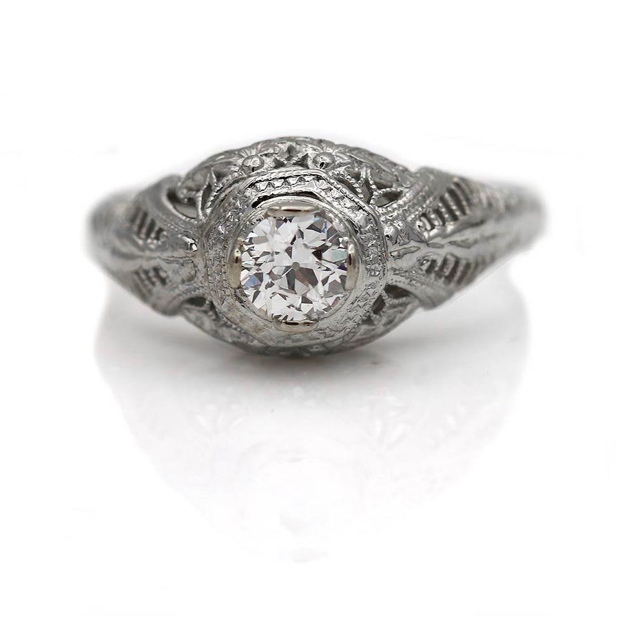 The Darlene ring is an authentic vintage engagement ring from the Art Deco era circa 1930's. The ring boasts a .41 carat GIA certified old European cut diamond of J color, VS1 clarity, residing in a geometric octagonal frame. Crafted in 14 karat white gold, accentuated with delicate open metal work and filigree engravings. A delightful ring, very hard to find and in good condition.