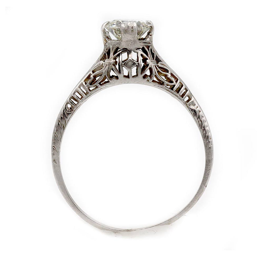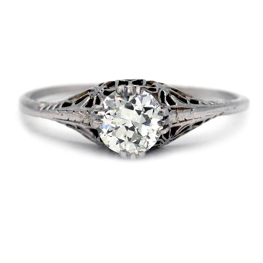 The Martine ring is an authentic vintage engagement ring from the Art Deco era circa 1930's. The ring features a sparkling .60 carat GIA certified old European cut diamond of J color, SI1 clarity. The diamond stands tall and proud in a trefoil prong setting. Crafted in 14 karat white gold, accentuated with open metal work and filigree engravings. A showstopping vintage ring. In excellent condition.