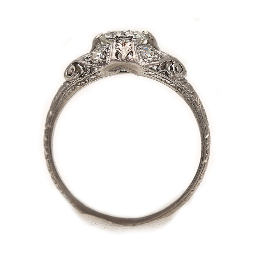 The Robyn ring is an authentic antique engagement ring from the Art Deco era circa 1920s. The ring boasts a GIA certified .66 carat old European cut diamond of F color, VS2 clarity. The diamond resides in a 4 prong setting surrounded by 4 single cut diamond accents and a very sleek split shank. Beautifully crafted in platinum, accentuated with swirling metal work and filigree engravings. A stunning vintage ring! We simply adore the intricate milgrain and filigree detailing. Magnifique!