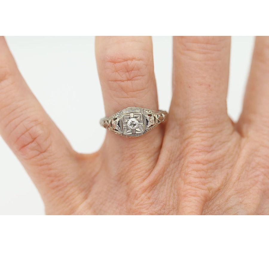 The Roddie ring is an authentic antique diamond engagement ring from the Art Deco era circa 1930's. The ring showcases a sparkling .15 carat old European cut diamond of H color, VS2 clarity, residing in a geometric square frame. Beautifully crafted in 14 karat white gold, completed with open metal work and floral engravings. A rare, one of a kind vintage ring. In pristine condition.