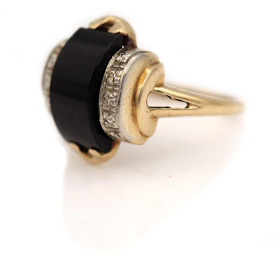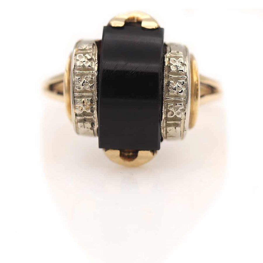 The Bing ring is an authentic vintage engagement ring from the Art Deco era, circa 1930s, showcasing a 1.50 carat vintage natural black onyx. Crafted in 14 kt two tone gold, and accentuated with filigree engravings, this is a consummate, and timeless, Art Deco piece, in very good condition.