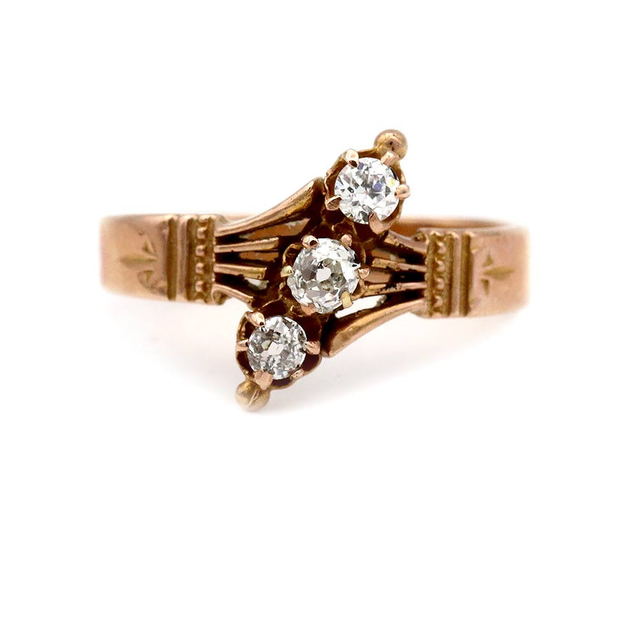 The Layla ring is an authentic vintage diamond engagement ring from the Victorian era circa 1899. The ring features 3 asymmetrically set old mine cut diamonds. Crafted in gleaming 14 karat rose gold, beautifully accentuated with open metal work and intricate filigree engravings. A beautiful jewel, in excellent condition. Signed and stamped "1899."