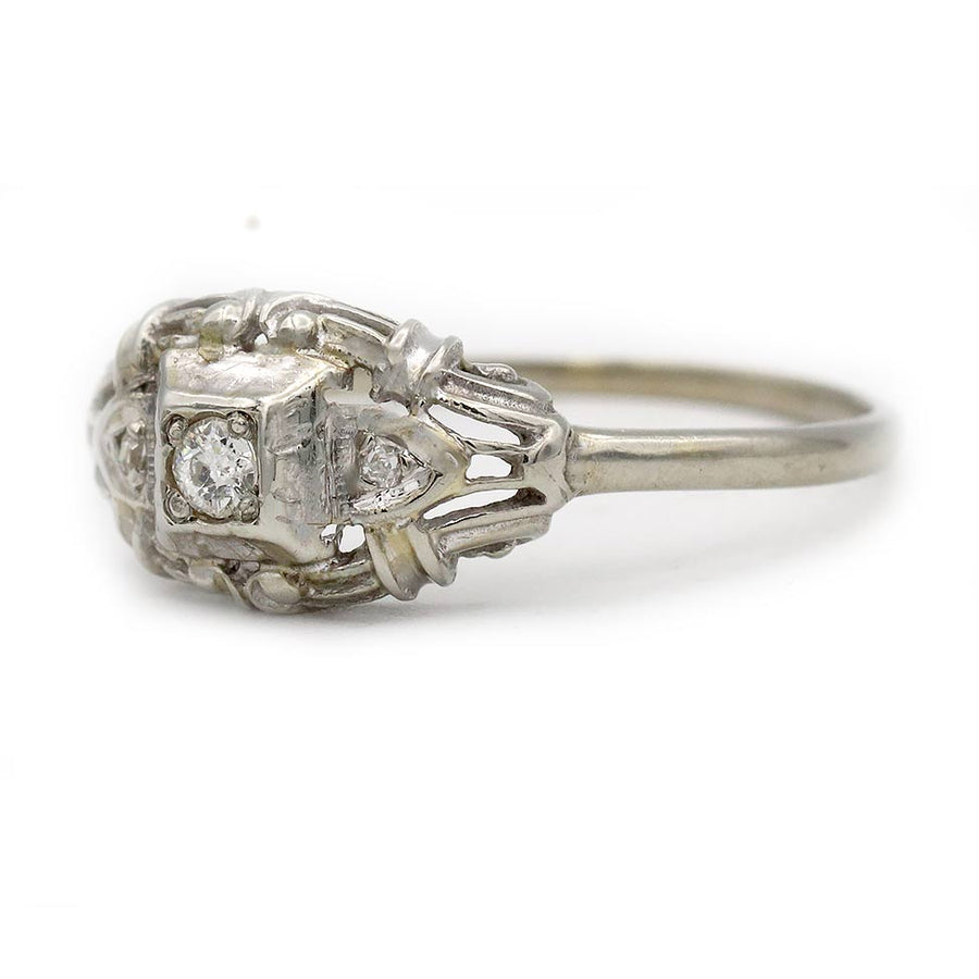 The Fidelity ring is an authentic vintage engagement ring from the Art Deco era circa 1930's. The ring features a .08 carat old European cut diamond of F color, VS2 clarity, residing within a geometric square frame. The diamond is flanked by 2 single cut diamond accents. Crafted in 18 karat white gold, completed with open metal work and delicate milgrain engravings. Signed and stamped "Fidelity". A consummate vintage piece, In very good condition.