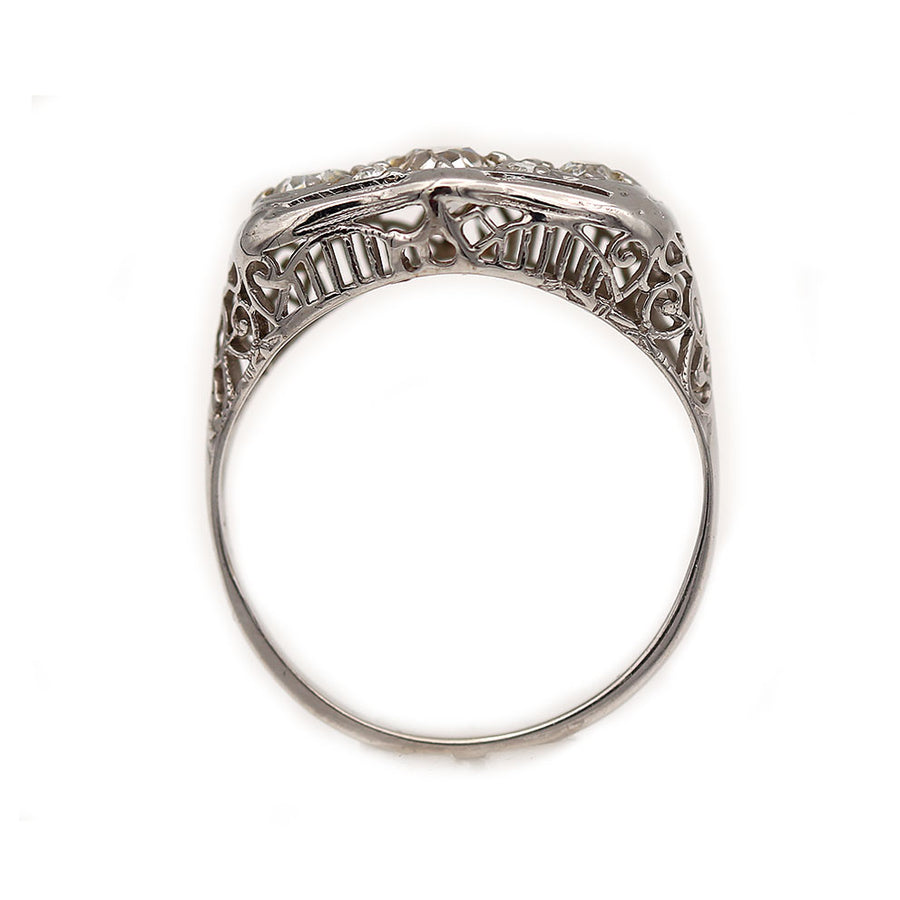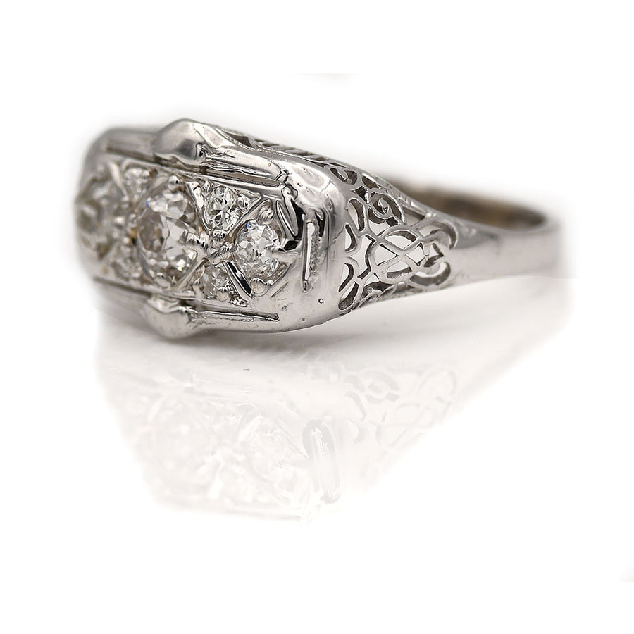 The Kerri ring is an authentic vintage engagement ring from the Art Deco era circa 1930's. The ring features 3 old mine-cut diamonds weighing .35 carats of H color, VS2 clarity, complemented by 4 dainty mine cut diamond accents. Crafted in 14 karat white gold, accentuated with open metal work. A unique low profile ring. Perfect to wear on either hand or to stack with other bands. In very good condition.