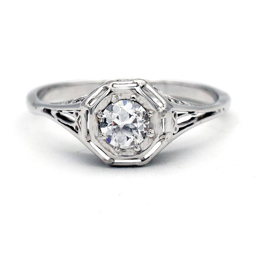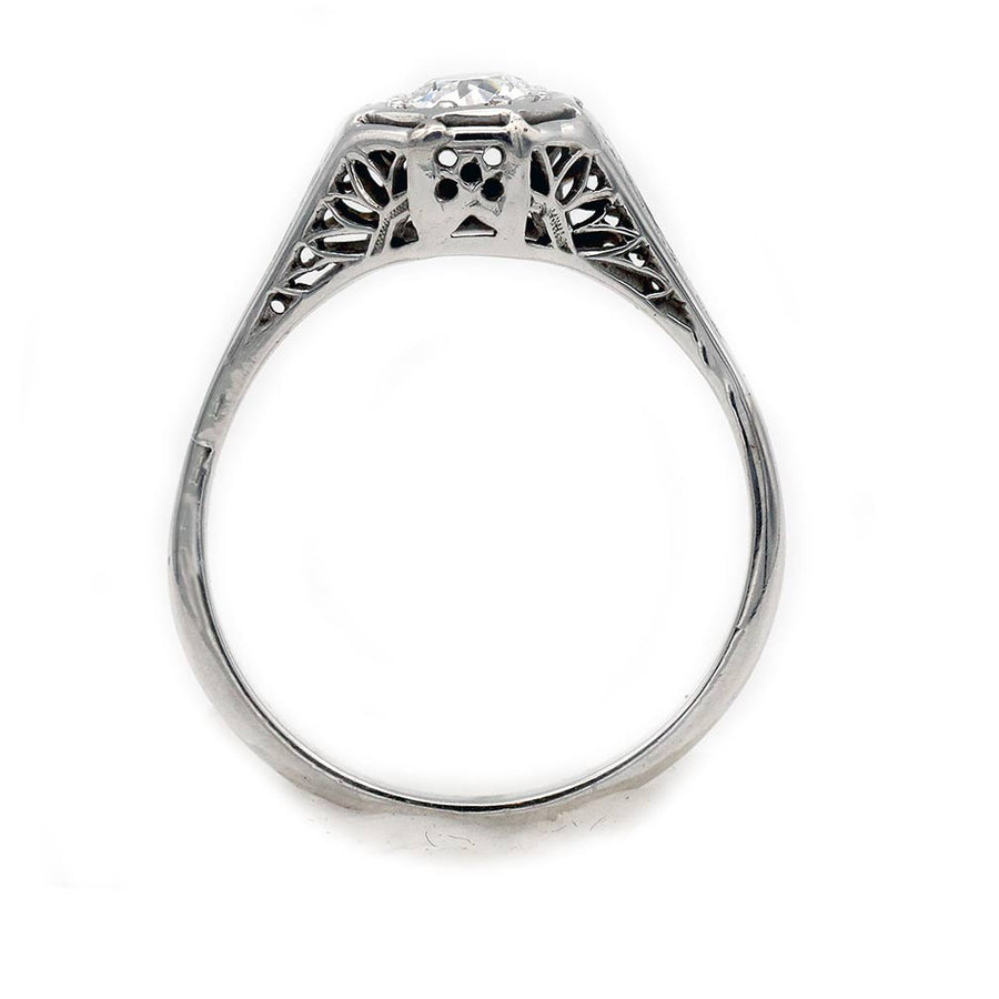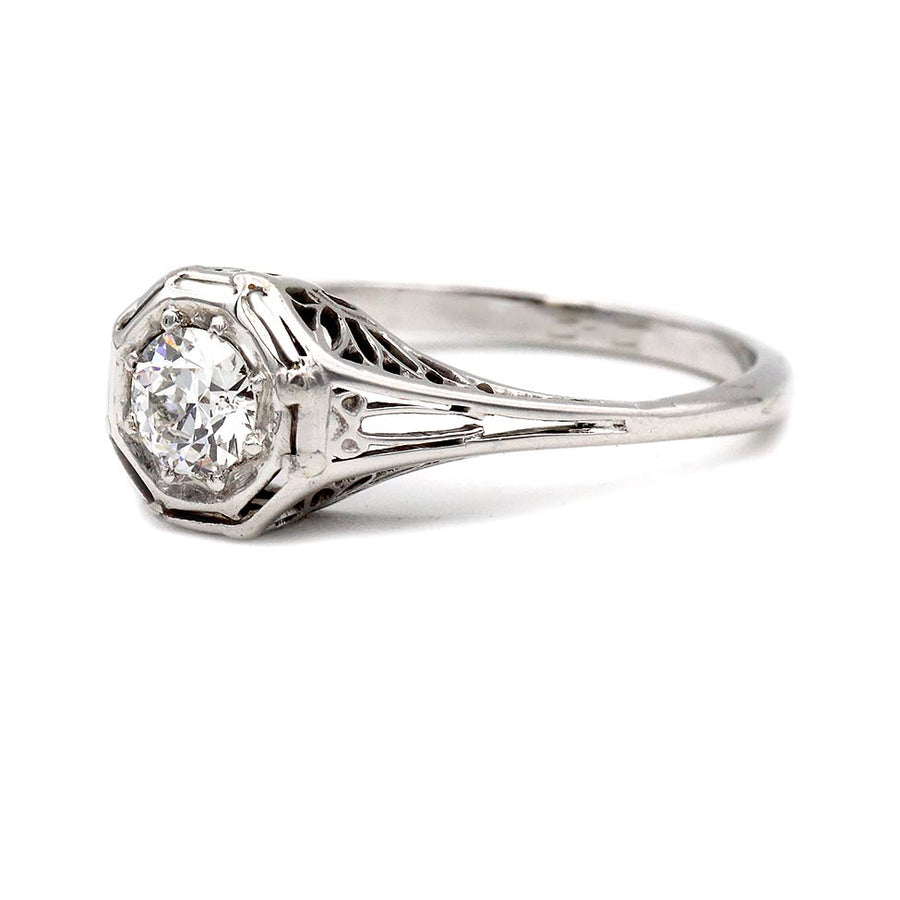 The Veeka ring is an authentic vintage engagement ring from the Art Deco era circa 1930's. The ring highlights a .35 carat old European cut diamond of F color and I1 clarity, residing in a octagonal frame. Crafted in 14 karat white gold, completed with open metal work and floral engravings. Perfectly vintage with a lovely antique patina finish. In good condition.