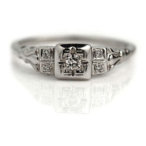 The Vivianne ring is an authentic vintage engagement ring from the Art Deco era circa 1930s. The ring boasts a .10 carat old mine-cut diamond of G color, VS2 clarity, residing in a geometric square frame. The diamond is flanked by 4 single cut diamond accents. Crafted in 14 karat white gold, accentuated with delicate engravings. A consummate Art Deco piece! In very good condition.