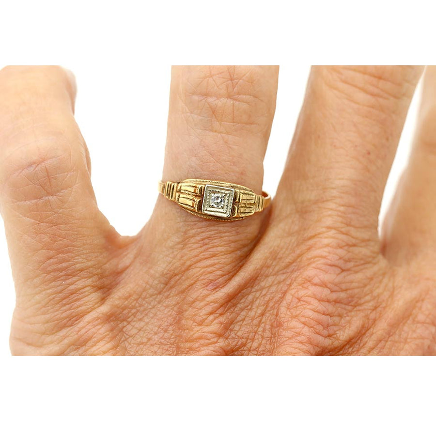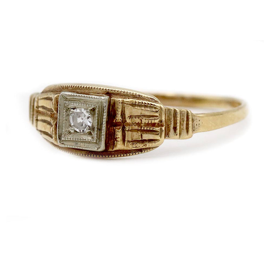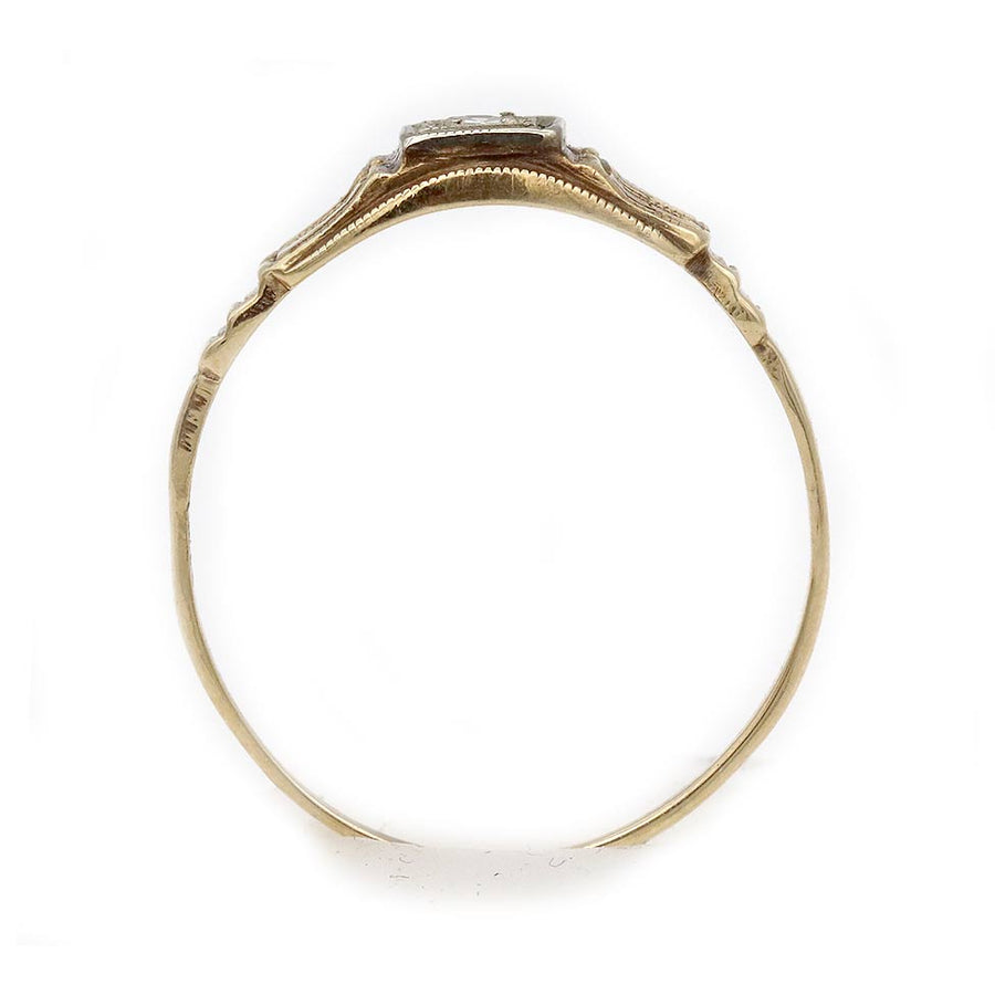 The Noa ring is an alluring and authentic vintage diamond ring circa 1940's. The ring features a petite .05 carat single cut diamond of H color, SI1 clarity, residing in a two-tiered square milgrain frame. Crafted in a 14 karat white gold basket atop a 14 karat rosy-yellow gold ring, beautifully accentuated with delicate filigree engravings. A pretty vintage ring, in very good condition.
