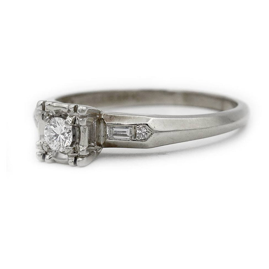 The Rachelle ring is an authentic antique ring from the 1940's. The ring centers a bright white, illusion set .20 carat transitional cut diamond of E color, VS1 clarity. The diamond is flanked by 2 straight baguette diamonds and 2 single cut diamond accents. Crafted in 18 karat white gold. A sweet, charming little gem, in excellent condition.