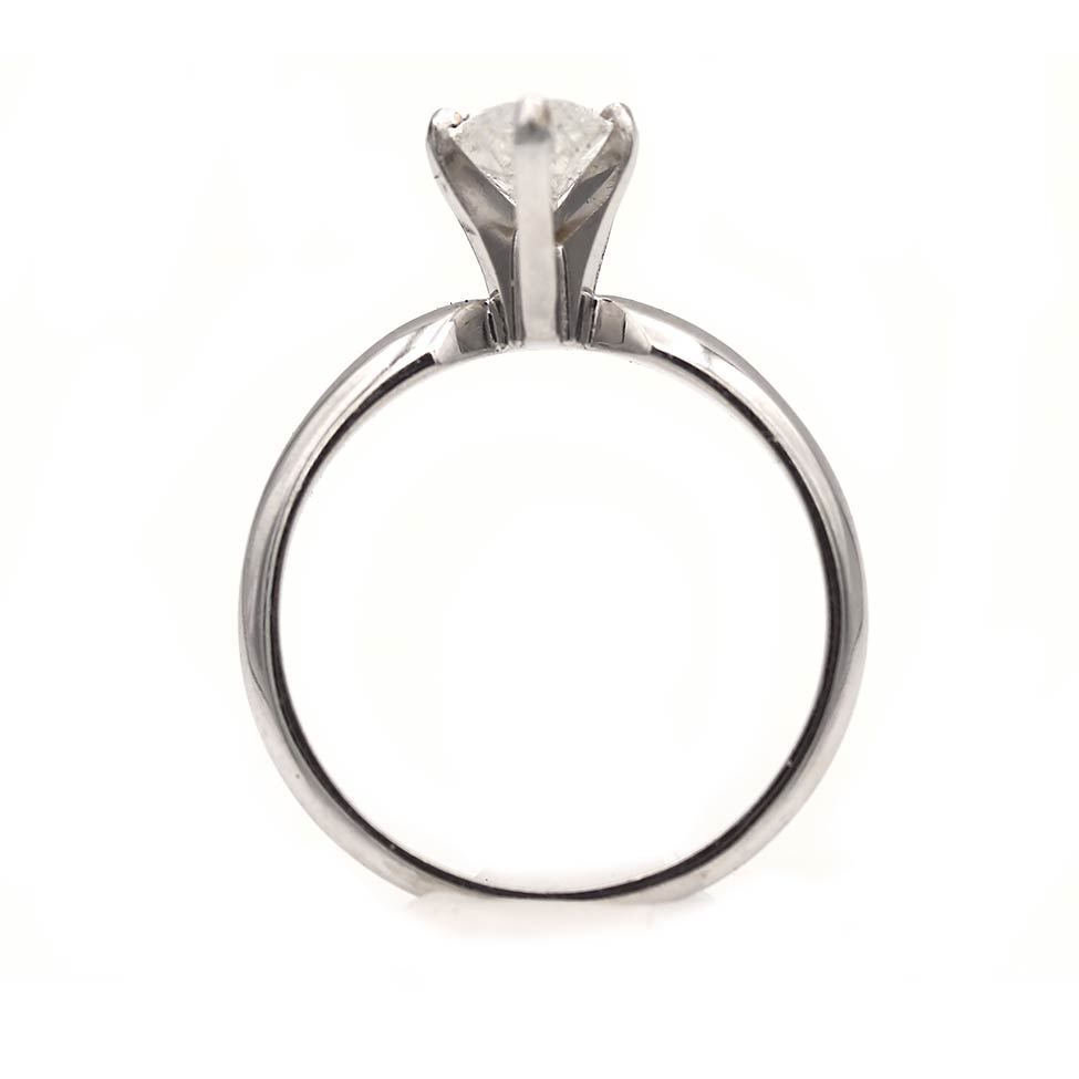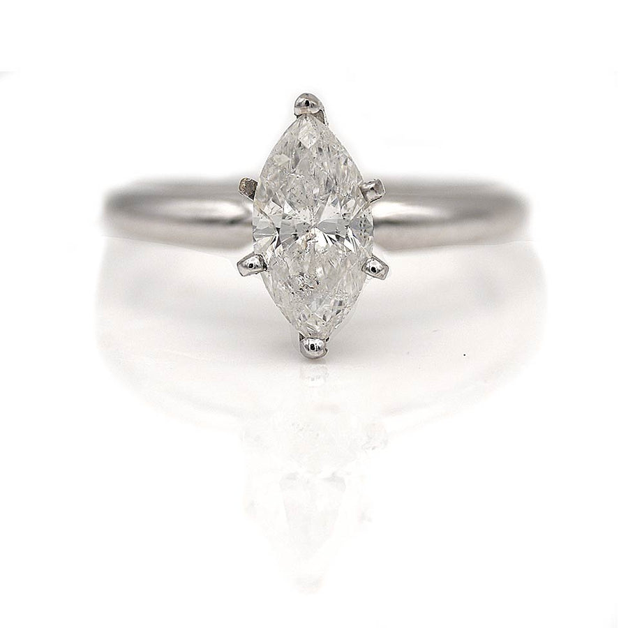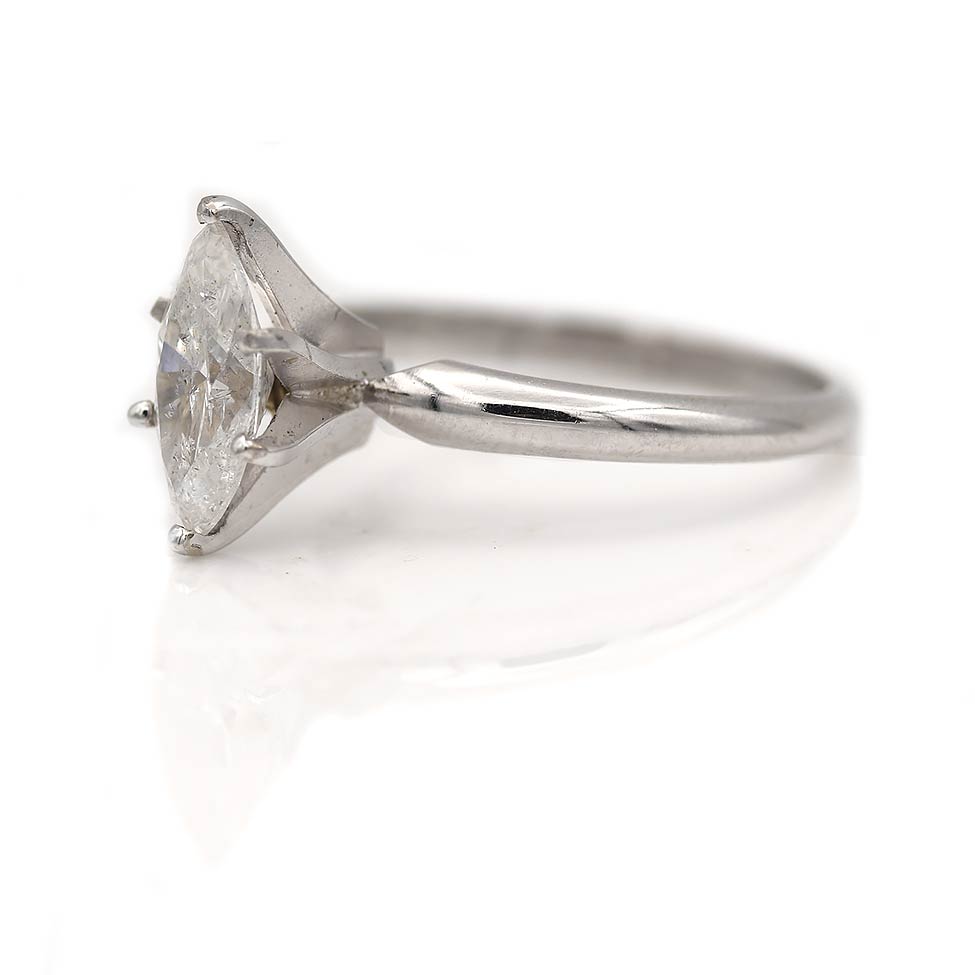The Treena ring is an authentic vintage engagement ring, circa 1980s. This ring features a 1.19 carat GIA certified marquise cut diamond of F color, I3 clarity, set within a classic 14 kt white gold, 6 prong solitaire setting. In very good condition.