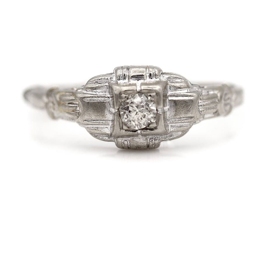 The Ramona ring is petite and authentic vintage ring circa 1920s. The ring features a .20 carat light-brown old European cut diamond, residing in a geometric square frame. Crafted in 14 karat white gold, accentuated with delicate filigree detailing. A little Art Deco gem, in good condition.