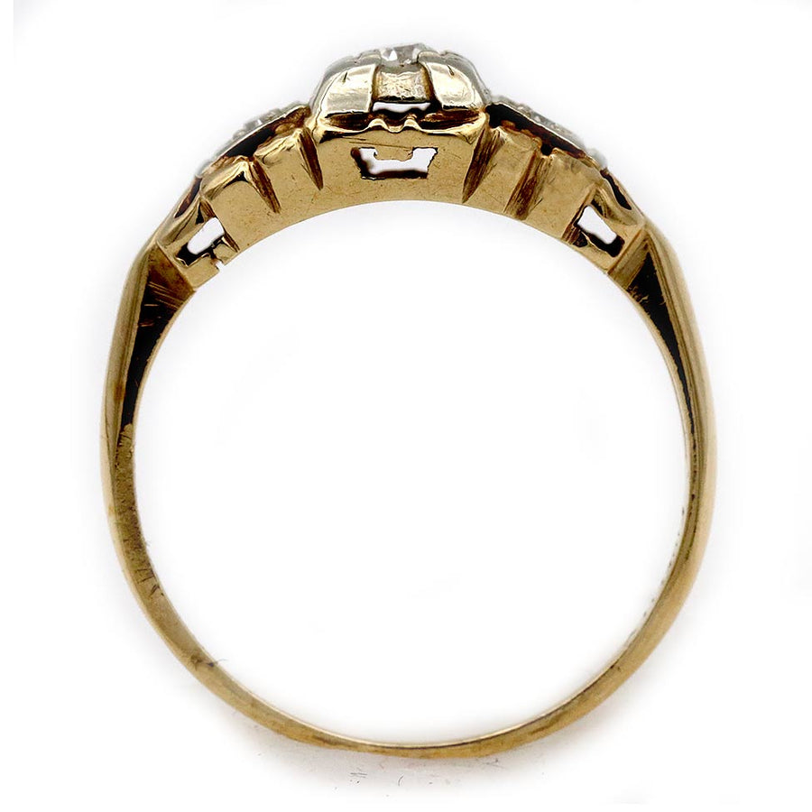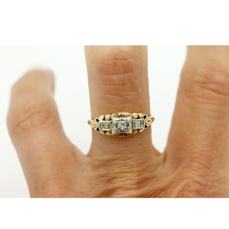 The Klara ring is a classic and authentic 1940s vintage diamond engagement ring. The ring centers a bright-white .10 carat old European cut diamond of H color, SI1 clarity. The diamond is flanked by 2 single cut diamond accents. Handcrafted in 14 karat two tone gold, white gold atop a rosy-yellow gold ring, accentuated with filigree and milgrain engravings. A timeless 1940's ring. In very good condition.