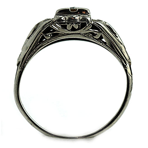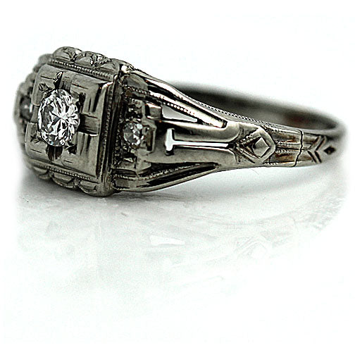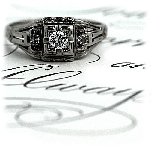 This very art Deco engagement ring contains 1 vintage Old European cut diamond, weighing appx 0.20 carats. Crafted in an 18 kt antique square geometric mounting, this vintage diamond is flanked by 2 single cut diamonds. Please notice the fantastic antique mil grain design work. Size 4 1/2 and easily sized. AD# 4OSBX 4 $1250.00
