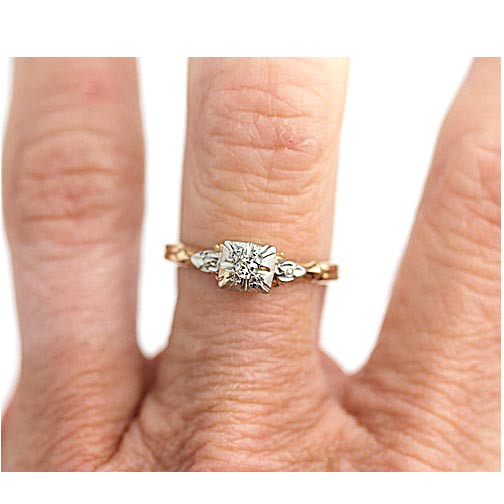 The Mags ring is an authentic vintage ring circa 1940's. The ring features a petite .08 carat single cut diamond, residing solo within a geometric square frame. Crafted in 14 karat white gold atop a rosy-yellow gold ring, completed with filigree engravings and a delicate fluted band. A vintage delight, in very good condition.
